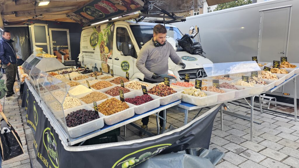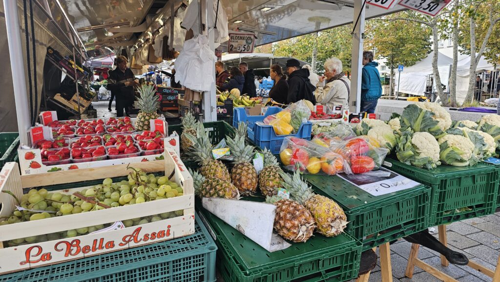 Otto und Rolf konnten gegen einen kleinen Obolus zu uns zum Frühstück kommen und so ließen wir alles langsam angehen. Zumal es auch noch trübe und nieselig und stürmisch war. Aber als wir beschlossen, zum Wochenmarkt zu gehen, brach der Himmel auf und die Sonne kam durch. Das fanden wir natürlich wunderbar. Aber der Wind bließ mit Sturmstärke trotzdem eisig um unsere Gesichtszinken.
