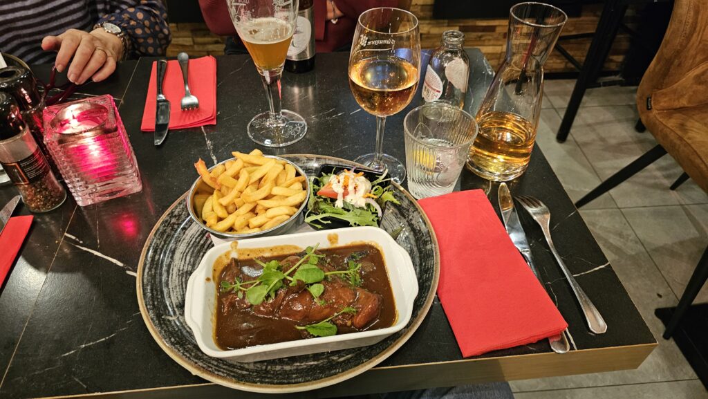 P.S.: Ich muss es loswerden. Der Reiseführer vom Stadtrundgang fragte die Teilnehmer, wie man „French Fries“ von „Belgium Fries“ unterscheiden könne. „?“. Antwort: Wenn sie schmeckten, kämen sie aus Belgien. Es ist so, dass man zu allem Fritten bekommt. Moules&Frites, Muscheln mit Pommes. Flämisches Stew? Fritten. Königinpastete? Fritten! Steak? Fritten. Eiscreme? Fritten!! Selbst zu Pommes Frites gibt es Fritten! Abends öffnete ich meine Tablettendose, es lagen Fritten drin. Ich kann sie nach drei Tagen jetzt leider nicht mehr sehen. Aber es waren oft sehr gute dabei. Und die Mayo und der Senf oft deutlich schmackhafter als bei uns.