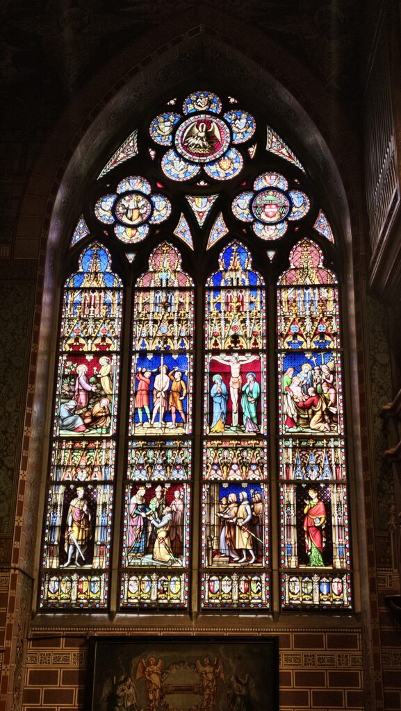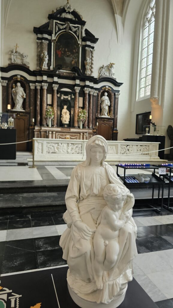 Ich startete einen neuen Anlauf für die Madonna. Und diesmal gab es keinen Zerberus und keine Zerbera. Allerdings ist ein Teil der Kirche Museum und für dieses muss man 8 Euro Eintritt zahlen. Dafür sieht man interessante, von innen bemalte Backsteingräber (Wo sind eigentlich die Leichname hin? Da zahlt man ein Heidenvermögen für eine Kirchengrab und eine tolle Bemalung und ein paar hundert Jahre später wird man entsorgt, damit Touristen da reinglotzen dürfen!), prächtige Gemälde, Chorgestühl, die unglaublichen Grablegen von Maria von Burgund und Karl dem Kühnen und… die Madonna, gerade mal etwas über einen Meter zwanzig groß und in eine reich verzierte Wand eingelassen. Sehr schön. Ich setzte mich auf eine Bank, schaute sie eine Weile an und ging, nachdem es immer voller wurde.