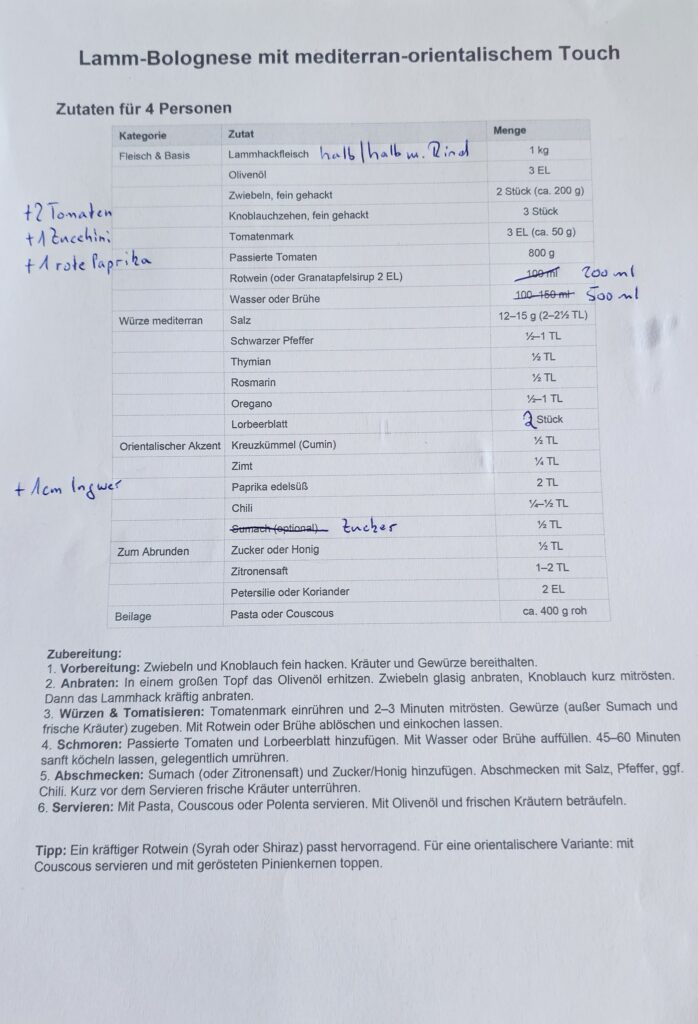 Chat-GPT spuckte dieses Rezept aus, das ich aber noch ergänzte (handschriftliche Eintragungen):
