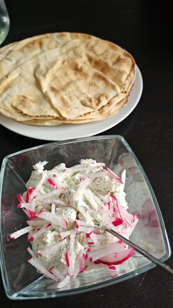 Die Nudeln (Orecchiette) habe ich nach Packungsanweisung zubereitet (für selbstgemachte fehlte mir der Elan, da ich auch noch parallel für morgen einen Kuchen buk) und es gab natürlich Tonnen von Reibkäse dazu. Wir fanden es ganz lecker. Als Appetithappen hatte ich übrigens arabisches Fladenbrot aufgebacken und einen Knoblauch-Dill-Quark mit Radieschenraspeln dazu gemacht.