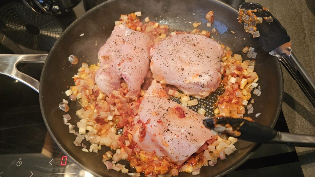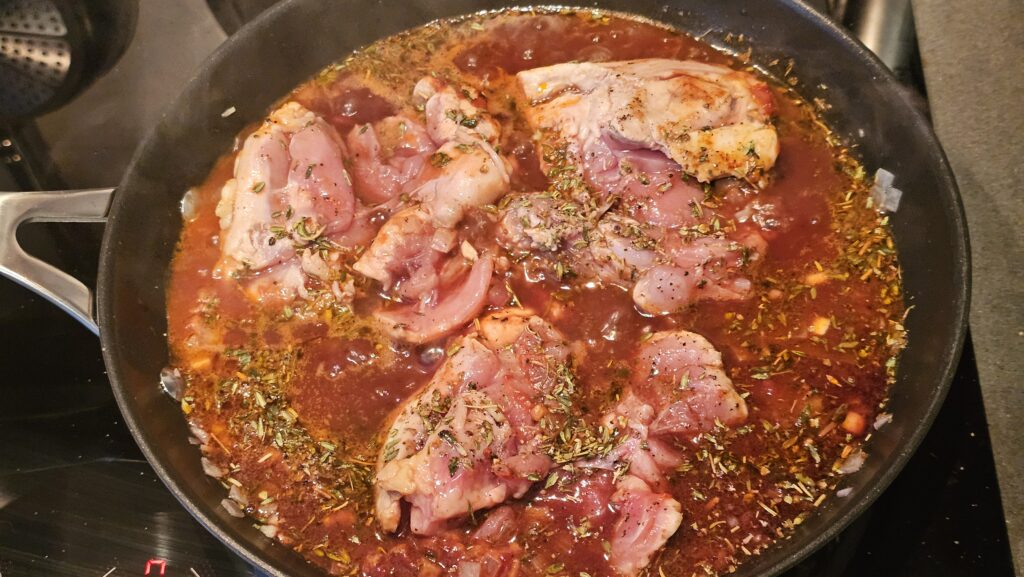 In einer Pfanne bei mittlerer Hitze einen halbzentimeterbreiten Streifen Butter schmelzen, da zwei kleingewürfelte Schalotten sowie drei gehackte Knoblauchzehen anschwitzen. Je einen gehäuften Esslöffel Senf und Tomatenmark dazu. Wieder bisserl anschwitzen. Dann vom Knochen gelöste Hühneroberschenkel zum Anbräunen hineingeben. Salzen, pfeffern, etwas gemahlene Chili, einen Esslöffel getrocknete Kräuter dazu (einen halben Thymian und einen halben Herbes de Provence bei mir, aber da kann man nehmen, was man mag), bisschen schmurgeln lassen und dann einen Barren Bouillonkonzentrat hinzugeben und mit einer halben Flasche Rotwein ablöschen. Deckel drauf und 30 Minuten blubbern lassen, ab und zu mal das Fleisch drehen.