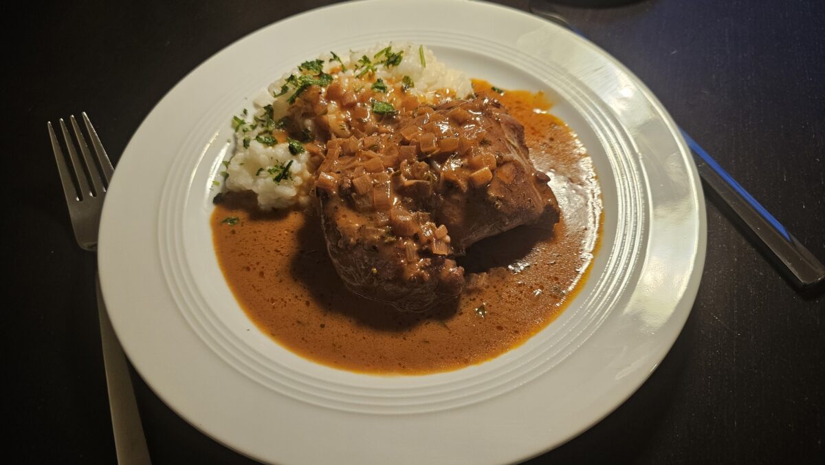 Anrichten (mit ein paar Kräutern oben drauf) und den Rest guten (!) Weins dazu kredenzen. Bei der langen Methode fällt das Fleisch von Knochen, alles schmeckt intensiver, aber ich habe auch bei dieser Variante die Sauce vom Teller geschleckt. Hat ja keiner gesehen 🙂