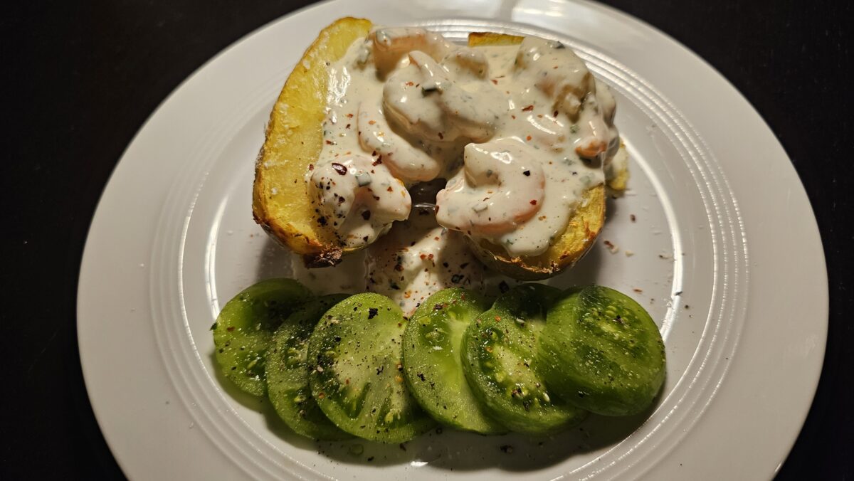 Ofenkartoffel mit Shrimps-Joghurt-Dip und grünen Tomaten