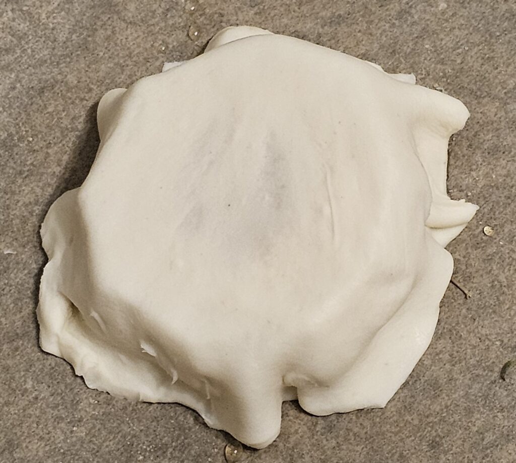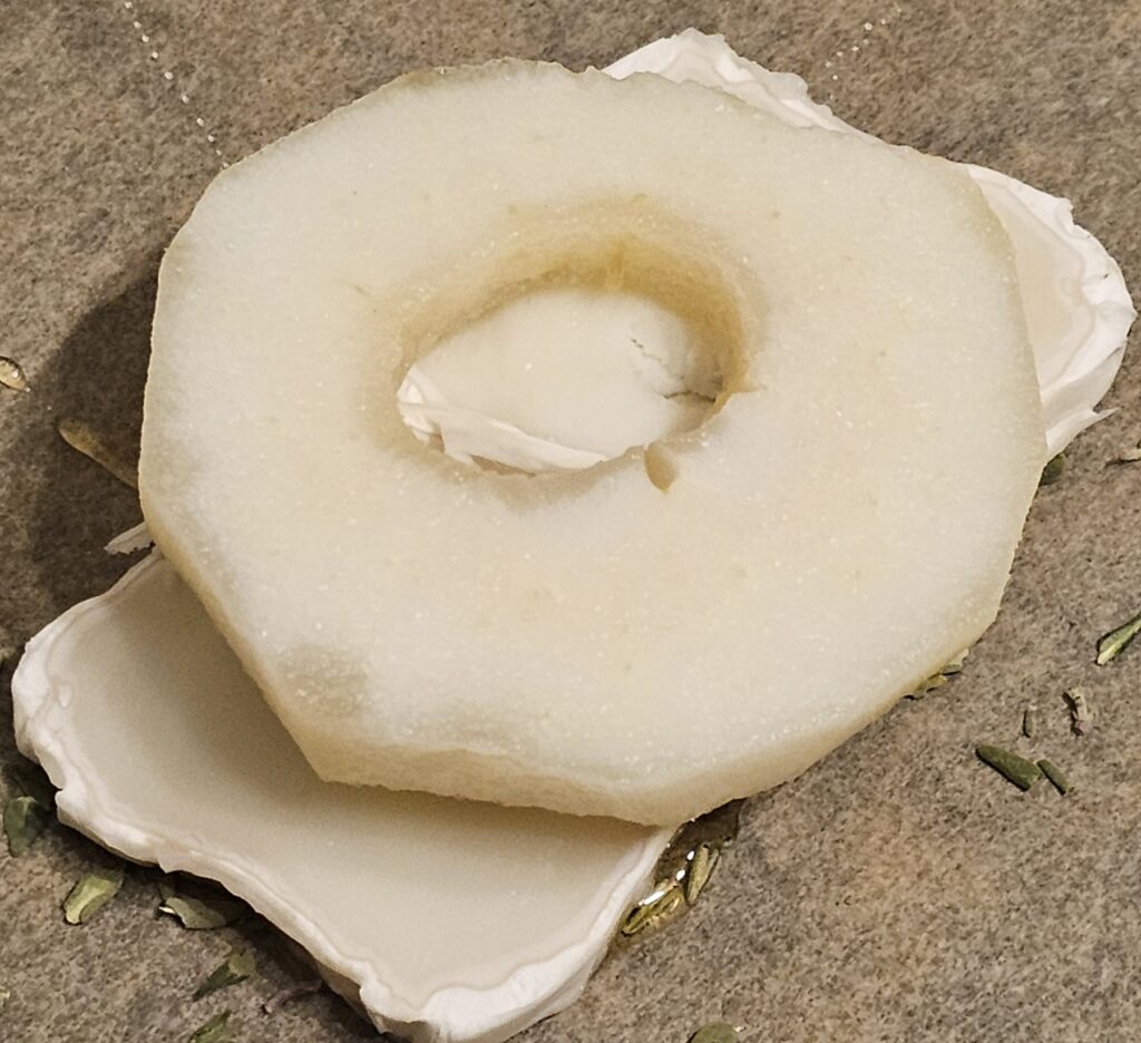 Die Idee zu den Törtchen ist nicht neu, viele Varianten kursieren bei Youtube oder in anderen Sozialen Netzwerken. Man gibt auf ein Backpapier, das auf einem Backblech liegt, einen Klacks Honig, auf den ein paar Kräuter (ich habe Thymian genommen), darauf eine Ziegenkäsescheibe (von der Rolle), darauf eine dünne Scheibe Birne. Den passend ausgeschnittenen, runden Blätterteig stülpen wir mit einem bisschen Rand darüber. Hier mal Schritt für Schritt:
