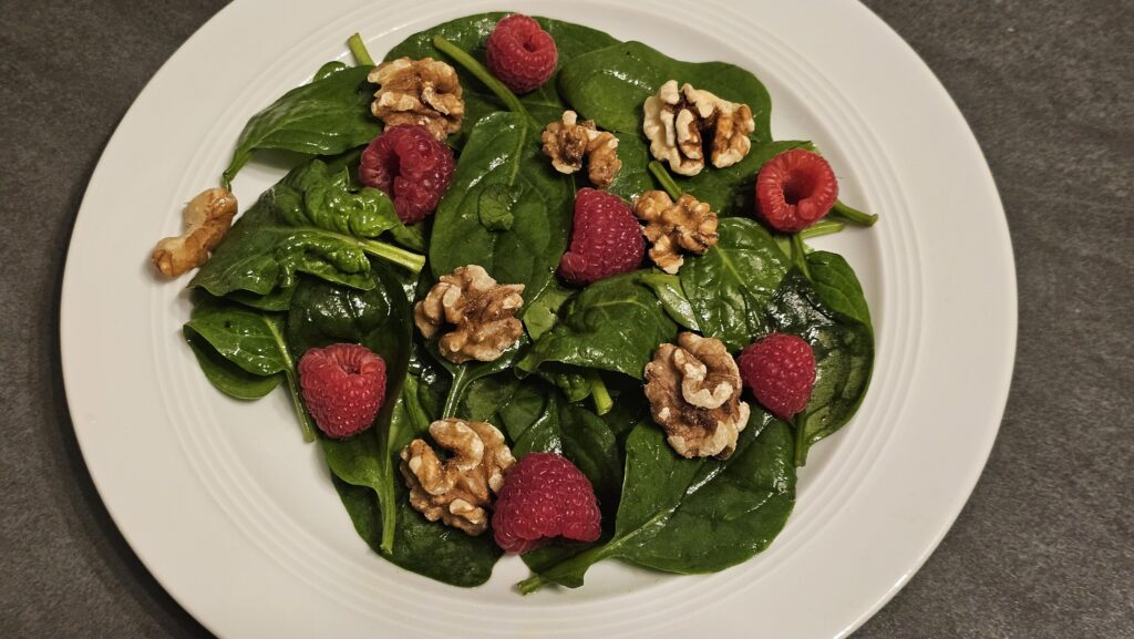 Den gewaschenen Spinat verrühren wir mit einer Vinaigrette (1 EL Öl, 1/2 EL weißer Balsamico, 1/ Teelöffel Senf, Pfeffer, Salz, Prise Zucker und bisserl Wasser, alles gut durchgeschüttelt), legen ein paar gewaschene Beeren und Walnusskerne dazu und akrobatisieren die Blätterteigtörtchen mit einem Salto Mortale oben drauf.