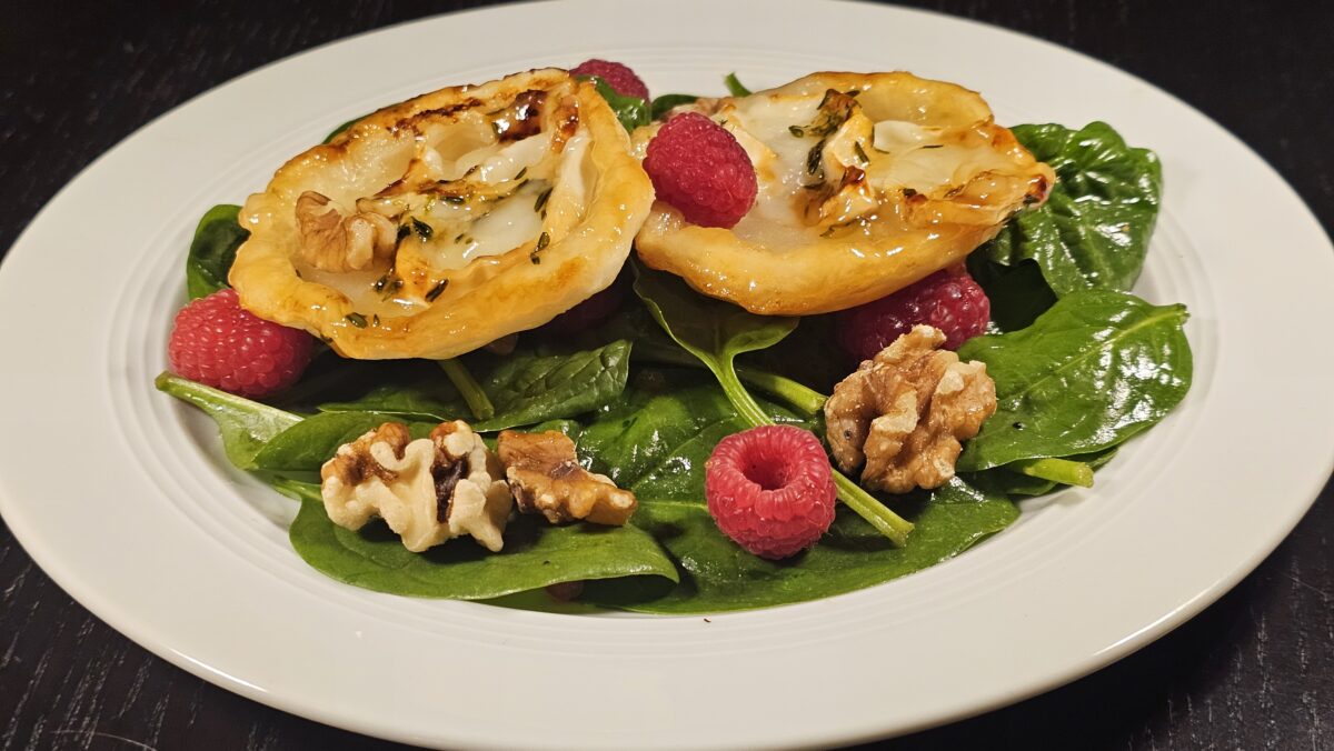 Ziegenkäse im Blätterteig auf Spinatsalat
