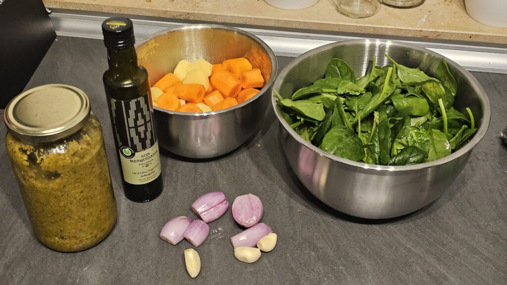 Ich putzte und würfelte grob etwa ein halbes Kilogramm Kartoffeln und 5 sehr große Karotten, schälte und zerhackte 4 Schalotten und 3 Knoblauchzehen. Die Zwiebeln und die Zehen briet ich im Auguste mit etwas Öl an. Dann gab ich die Gemüsewürfel dazu und kochte alles für eine halbe Stunde in einem Liter Gemüsebrühe. Anschließend gab ich die geschätzten 450 Gramm Spinat dazu und kochte alles für weitere 5 Minuten und pürierte die Masse anschließend.
