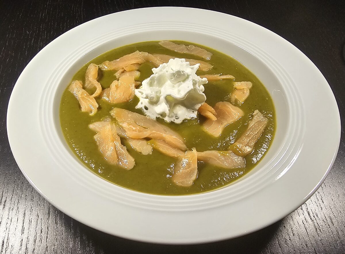 Serviert werden kann das dann pur oder aber mit Croutons, Schinkenwürfeln, sehr kross gebratenen Speckstreifen oder wie ich es machte – dann aber mit dem Salz in der Grundsuppe vorsichtig sein – mit Räucherlachsstreifen. Bei herzhaften Suppen kann man auch mal süße Schlagsahne als „Krönchen“ draufsprühen. Der Phantasie sind bei der Auswahl sowohl der Gemüse, als auch der Zugaben keine Grenzen gesetzt. Nur sollte ein Wurzelgemüse dabei sein, das die nötige Bindung schafft. Und klar, Stangenbrot dazu.