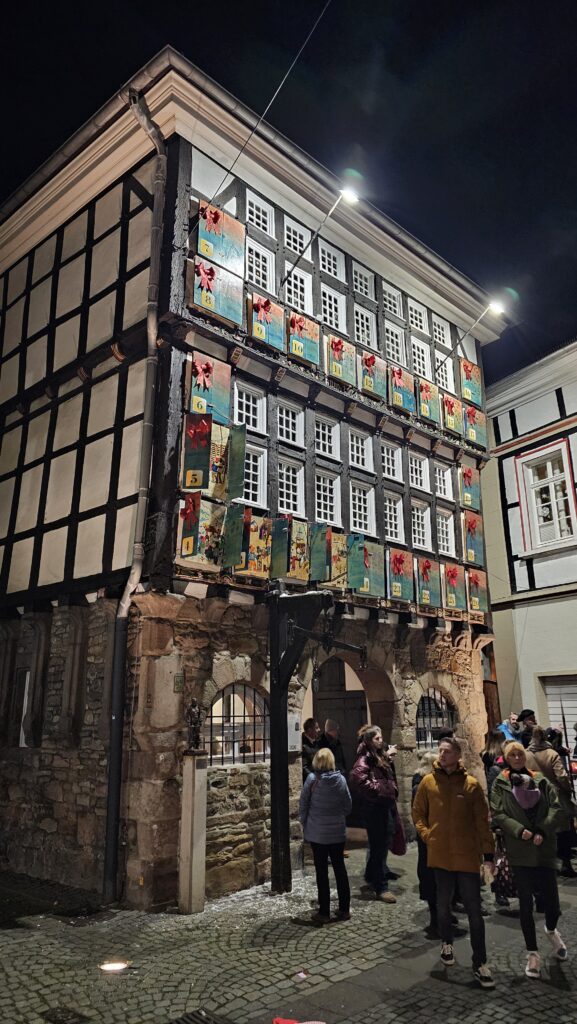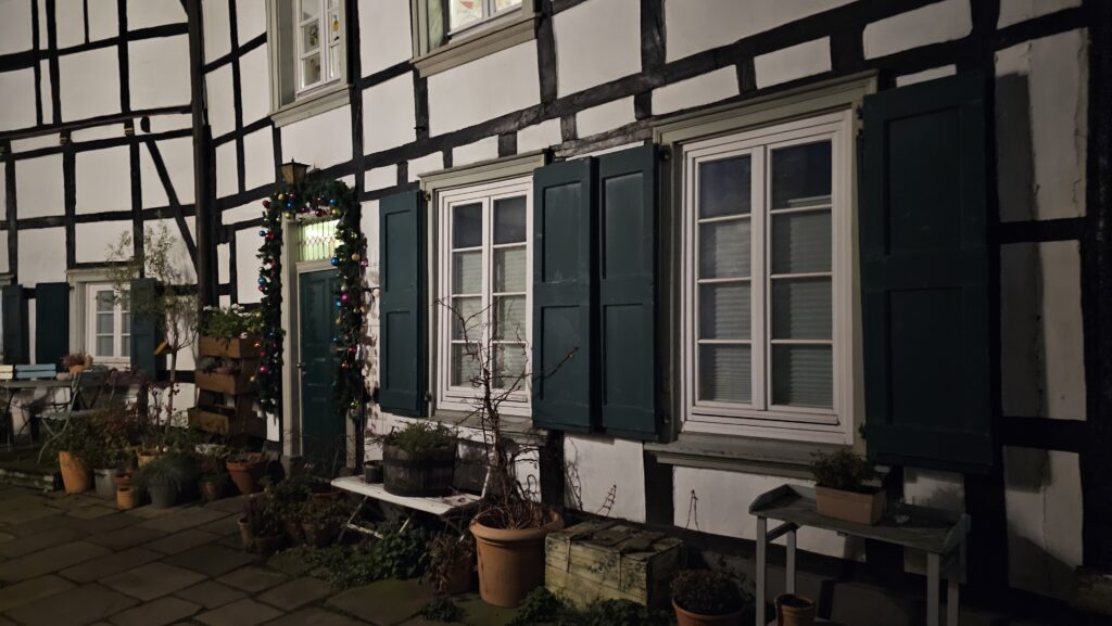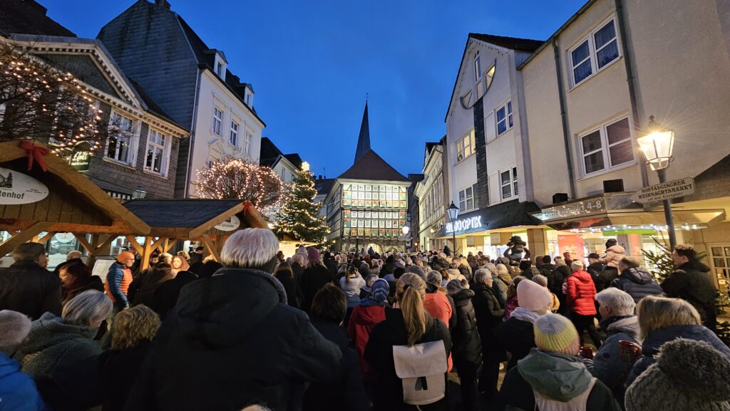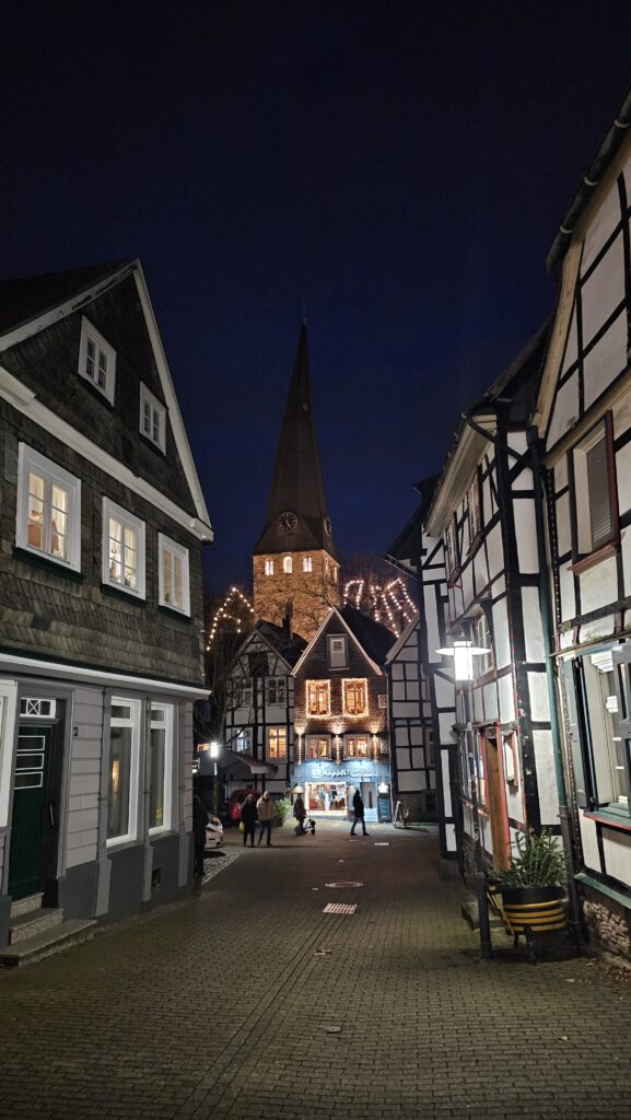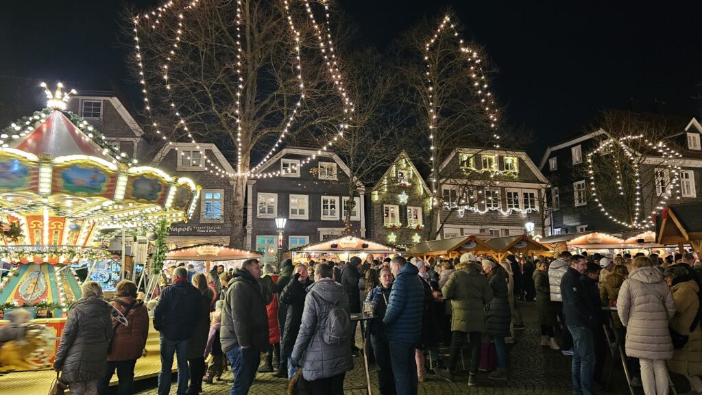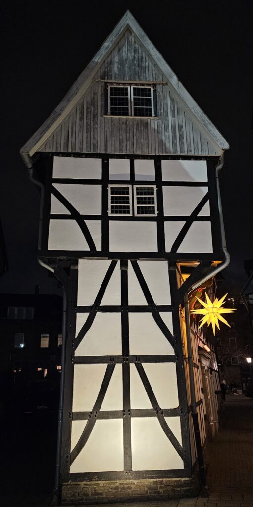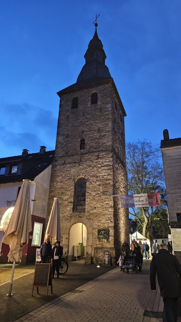 Freitag zog es mich dann direkt nach der Arbeit zu Stefan und Lars nach Hattingen, die beiden kenne ich – treue Leser wissen das – von einer Asienreise. Sie veranstalteten einen Currywurst-/Sekt-Empfang zu Advent. Da ich noch nie in Hattingen war, fuhr ich früh los, um mir den Ort ansehen und den Weihnachtsmarkt besuchen zu können. Herrjeh! War das überlaufen. Aber der Ort scheint wirklich nett zu sein. Am Glockenturm wartete ich vergeblich auf das für 18:05 Uhr angekündigte Glockenspiel, allein, der Glöckner schien mit seiner Esmeralda auf Karibikreise zu sein. Immerhin hatte ich dadurch Gelegenheit, am französischen Weihnachtsmarkt 8 Galettes für 8 Euro 10 zu erstehen. Waren aber auch lecker, muss man zugeben. Frau oder Herr Bürgermeister/in: Bitte erstatten Sie mir die Keksausgaben, die ich ja nur wegen des ausgebliebenen Musikgenusses erstand.