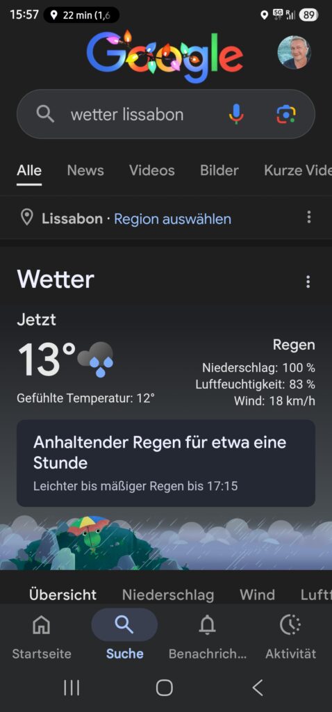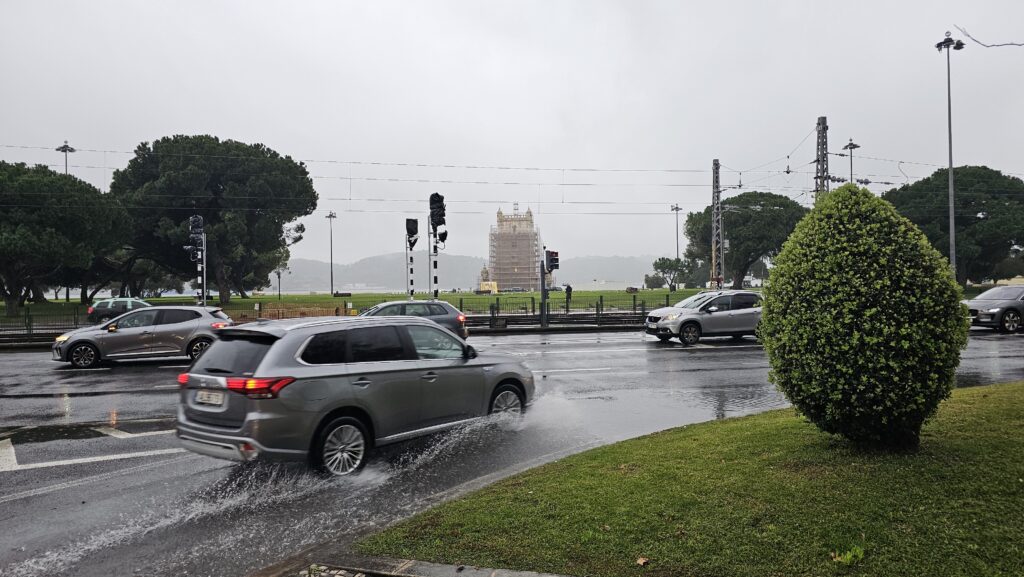 Mit der Metro war ich in kurzer Zeit an meinem Hotel. Nett und sauber, aber das Zimmer ist winzig. Der Kühlschrank, das finde ich ja eigentlich toll, dass es überhaupt einen gibt, war leider vom Nachttisch zugebaut, da musste ich erst einmal umdekorieren. Ich machte mich katzenfrisch und stürmte in das nasskalte Wetter, um die Stadt wiederzuentdecken. Leute. Am Flughafen sagte die Wetter-App noch, es wäre bald alles überstanden, aber hustepiepen! Der Regen wurde immer schlimmer. Ich fuhr mit der Straßenbahn zum Torre de Belem, dort war dann endgültig Wolkenbruch. Ich fotografierte den eingerüsteten Turm aus der Ferne, da Montag ist, war der ohnehin geschlossen. Ich fuhr in die Gegenrichtung zurück, am teil-eingerüsteten und – weil Montag – geschlossenen Hieronymus-Kloster vorbei. Museum für moderne Kunst? Montag! Ich bekam eine leichte Krise. Was nützt einem die Lissabon-Karte, wenn alles geschlossen ist?