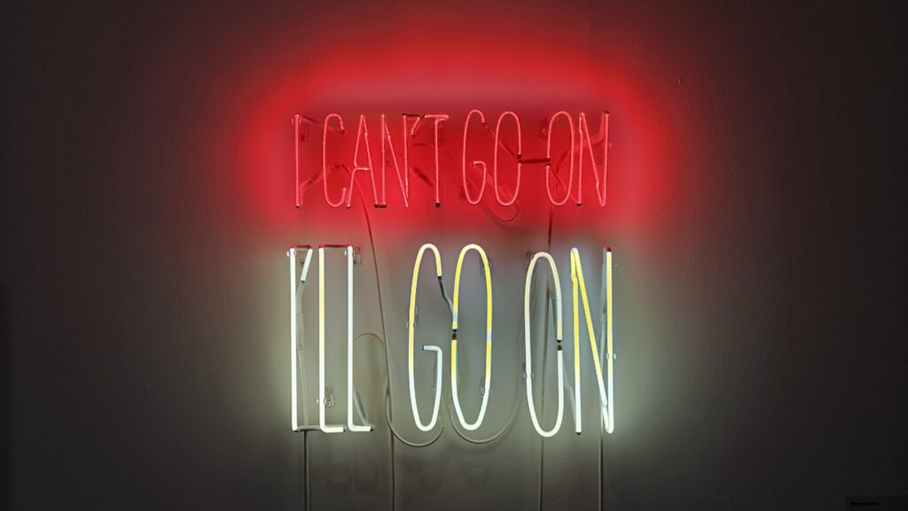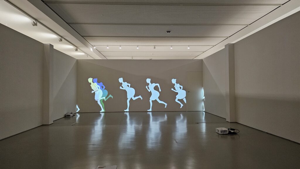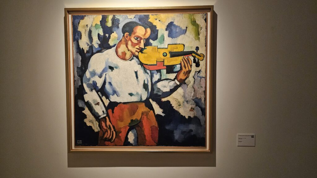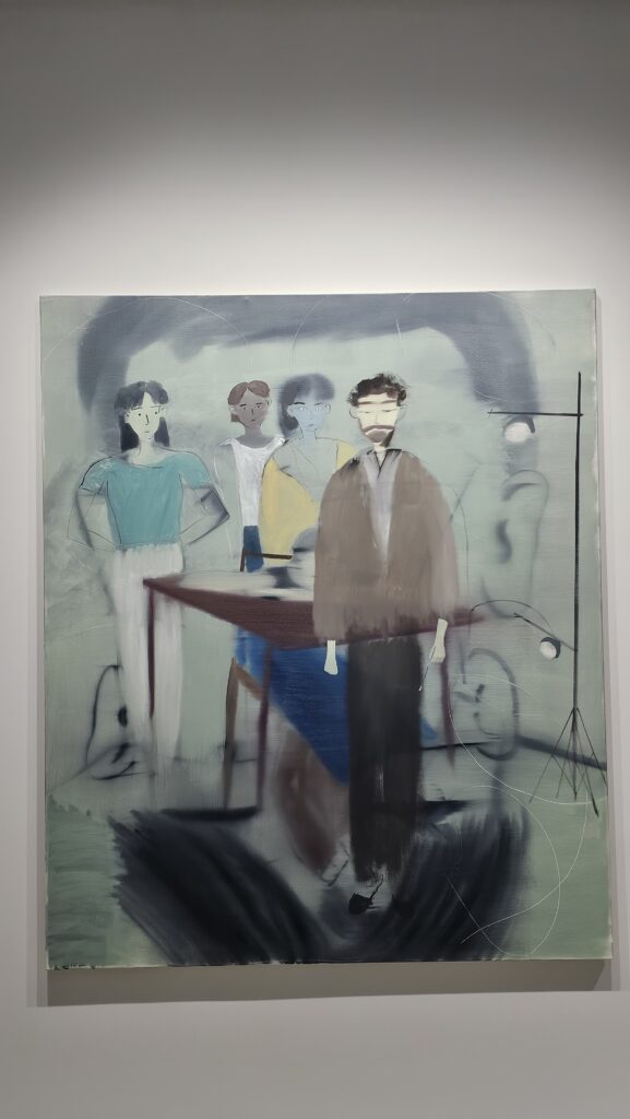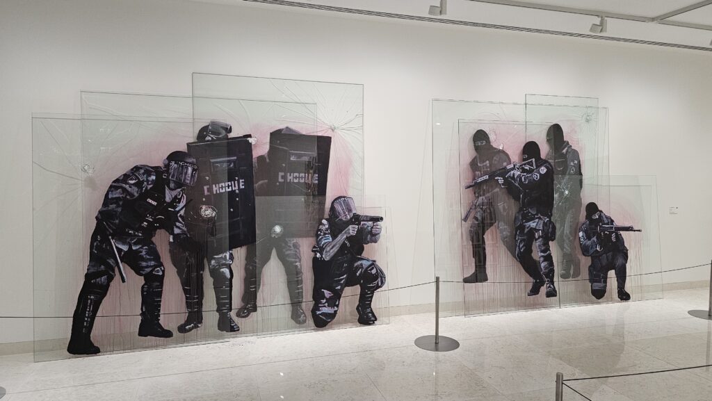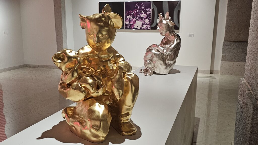 Die Bahn schlich die Trasse lang, der Verkehr ist bei so einem Wetter ganz schön chaotisch hier, so hatte ich Zeit, Google zu bemühen. Ein anderes Museum für moderne Kunst, das Museo de Arte Contemporánea Armando Martins hatte geöffnet. Es ist wahrschinlich das einzige Museum auf der Welt, das dienstags Ruhetag hat. Ein Segen! Ich bekam 10% Lissabonkarten-Diskont für 3 Ausstellungen in 4 Gebäudeteilen. Die Galerias 3 und 4 erreicht man über einen Hof, da startete ich. Das war sehr schön, sehr leer, sehr lehrreich und vielfältig. Viele Ausstellungsstücke haben mir ausgesprochen gut gefallen. Dann wollte ich zurück ins Hauptgebäude, allein, die Sintflut war über uns hereingebrochen. Ich hätte den zuvor erwähnten Hof paddelnd überqueren müssen. Wie gut, dass es noch ein Museumscafé gab, da bestellte ich mir eine Pastel de Nata, einen dicken Keks und ein Glas Wein, und wartete, bis der Sturzbach von oben ein Ende fand. Das tat er irgendwann und ich besuchte den Rest des Museums. Vor einem Raum warnte ein Schild vor expliziten Darstellungen, die verstörend wirken könnten. Siehste mal, das katholische Portugal.
