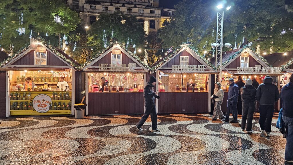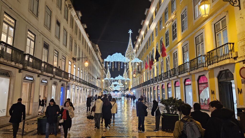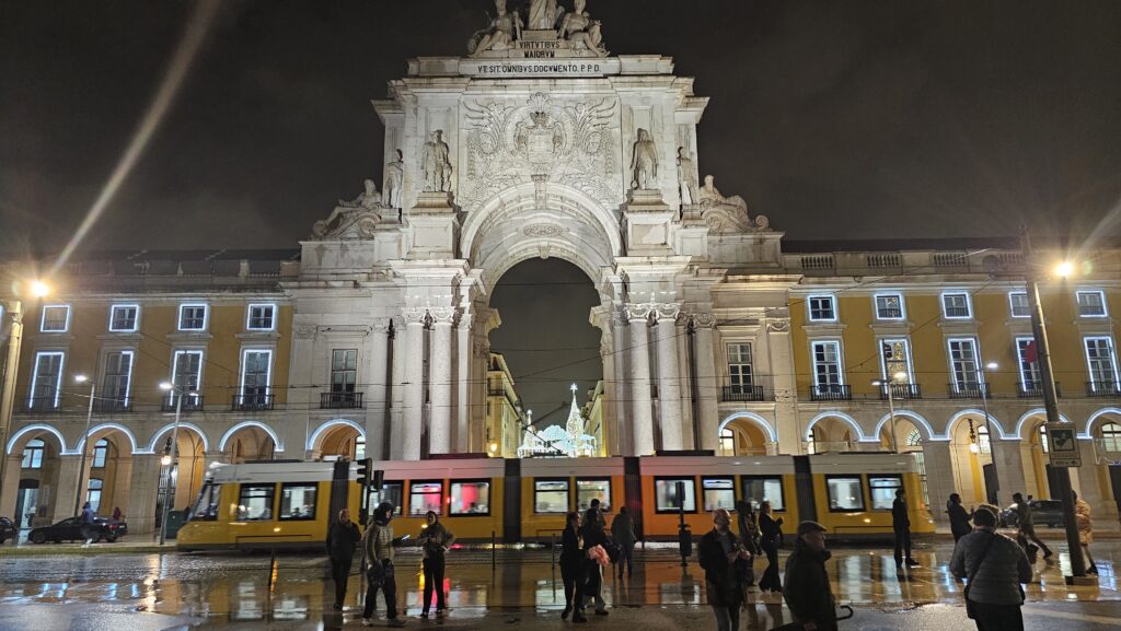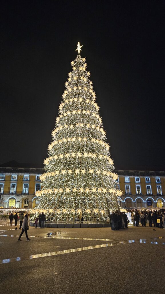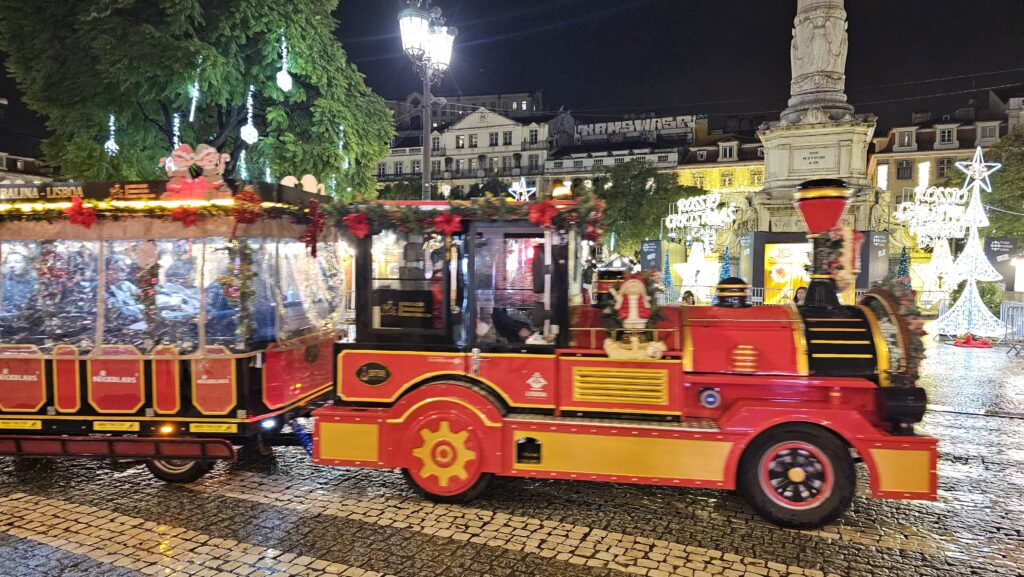 Vom Museum aus, es war zwar immer noch usselig, aber nieselte nur noch fein, begab ich mich zum Praça do Comércio, wo ein gigantomanischer Weihnachtsbaum steht. Direkt gegenüber der Triumphbogen, dessen Portal auf die Rua Augusta einlädt, Lissabons Touristenprachtmeile. Die lief ich lang, wimmelte 263 Restaurantwinker ab, schlug 91 Geschäfte mit Drogendealern aus und erstand stattdessen lieber Kühlschrankmagnete, die ich erstaunlich preiswert für einen solchen Hotspot fand. Am Praça Rossio dann fand ich mich auf einem nicht besonders gut besuchten Weihnachtsmarkt wieder.