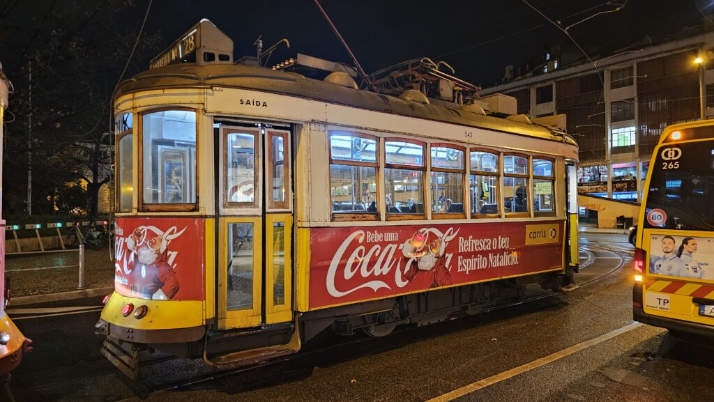 Inzwischen war es schon 20 Uhr und ich hatte einen Bärenhunger, war aber auch ein wenig erschöpft. So erstand ich in einer Padaría 4 herzhafte Pasteten zu je einem Euro, kaufte mir zwei Dosen Sagres-Bier und eine Flasche Wein im Supermarkt und begab mich auf Heimreise. Die trat ich am Rossio in einer vollkommen leeren Linie 28 an, die fast genau vor meinem Hotel hält. Die historischen Bahnen auf dieser Linie stammen aus den 30er-Jahren und sind eine Touristenattraktion sondergleichen. Ach, und die Pasteten waren superlecker!
