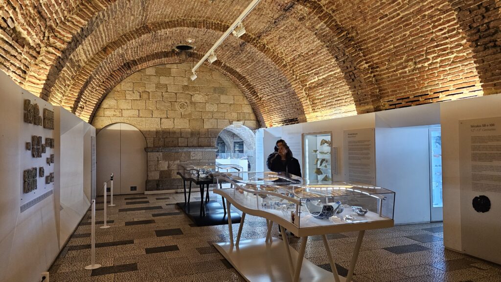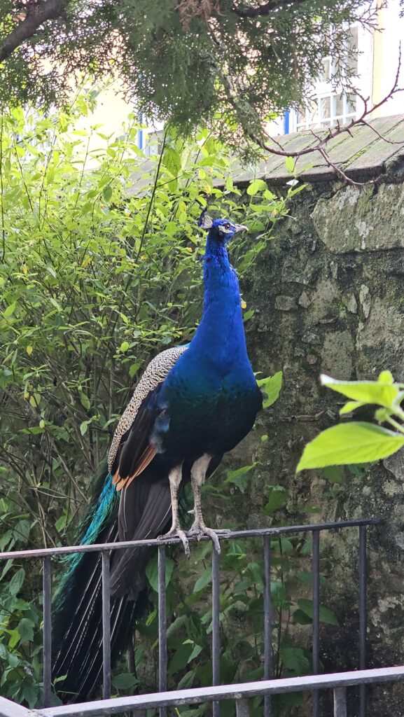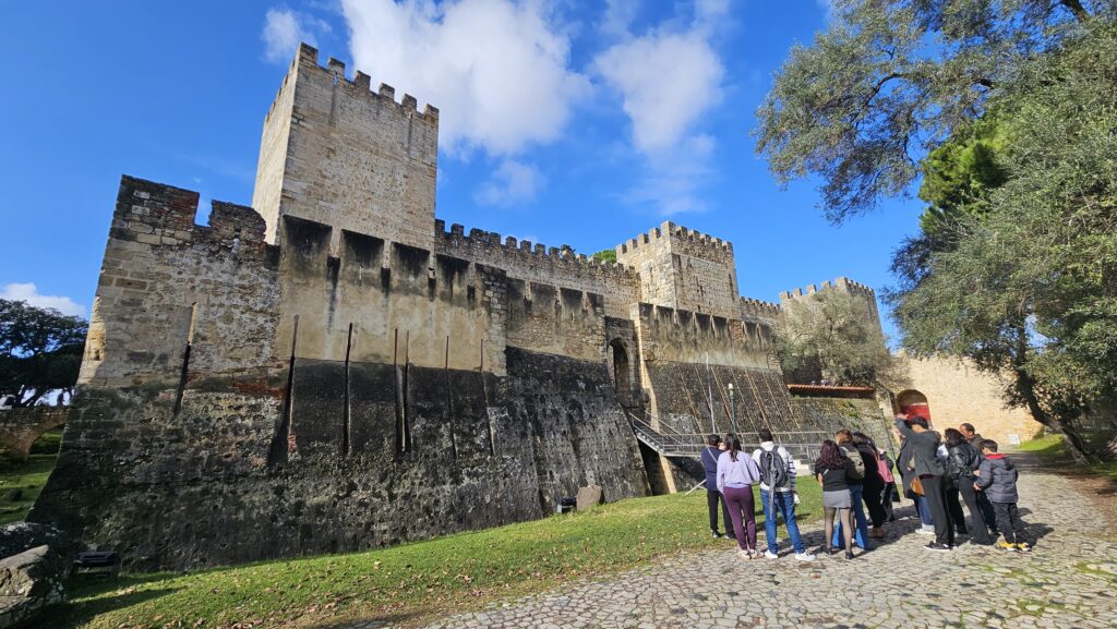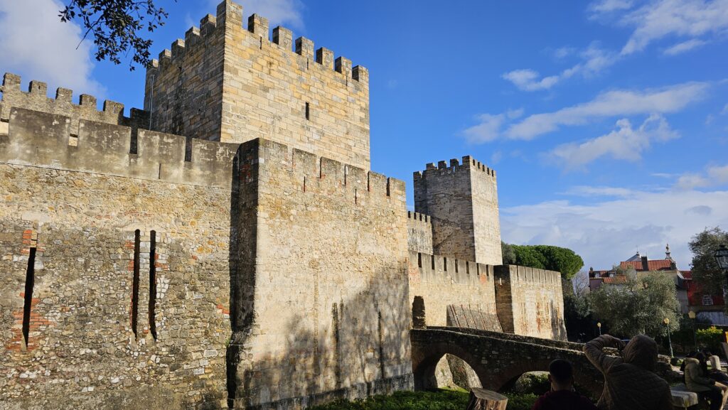 Ich stieg, nachdem ich noch ein bisschen durch das hübsche Viertel streunte, erneut in eine 28, diesmal deutlich leerer und fuhr wieder in die Unterstadt, wo ich den Bus 737 zum Kastell nahm. Das Gelände ist ziemlich weitläufig, die Festung gut erhalten. Spektakuläre Aussichten, ein mäßig interessantes Museum, eine Ausgrabungsstätte und gegen Ende mehrere Tausend Kreuzfahrer. Nein, nicht die aus Jerusalem. Die zwei Riesenschiffe sah man von der Burg aus im Hafen liegen. Ich weiß ja aus Erfahrung, so ab 10 Uhr werden die Passagiere von der Leine gelassen und dann Gottes Gnade demjenigen, der unschuldig im Weg steht. Die Burg ist von mehreren Pfauen besiedelt, die insbesondere rund um das Museum umherstolzieren. Am Eingang sitzt zudem ein Mann, der mit Kaffee Bilder malt. Er wirkt in seiner ganzen Aufmachung wie ein Relikt aus alter Zeit. O Castelo: Ein Muss!
