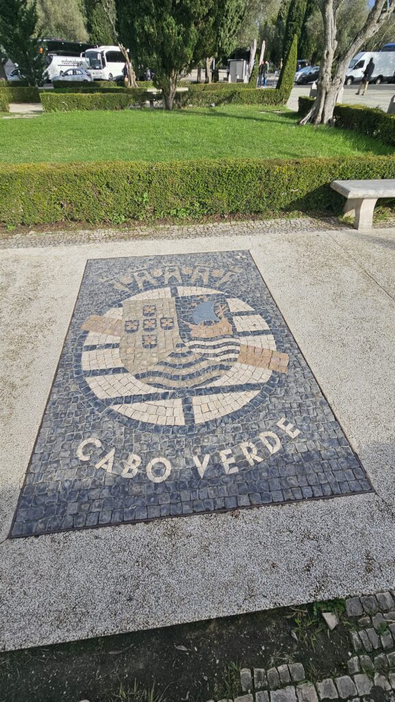 Durch den Jardim da Praça do Império schlenderte ich zum Entdeckerdenkmal. Im Park selbst sind im Kopfsteinpflaster die Wappen portugiesischer Städte und Inseln eingelegt, auch von Cabo Verde, das schon geraume Zeit unabhängig ist. Portugal hat übrigens eine übertrieben entspannte Haltung bezüglich seiner Kolonisationsgeschichte, wie mir deucht. Das Denkmal ist nämlich erst 50 Jahre alt. Eigentlich ist es ja das Denkmal der Plünderer, Massenmörder und Unterdrücker. Nun ja. Ich nahm den Lift auf die oberste Plattform und hatte, Ihr ahnt es schon, Ausblicke. Diesmal hätte es mich aber fast runtergepustet, es war schon tagsüber windig, aber es wurde immer stürmischer. Gerade, wo ich dies schreibe, toben Boreas, Euros, Notos und Zephyros um die Vorherrschaft in der Stadt.