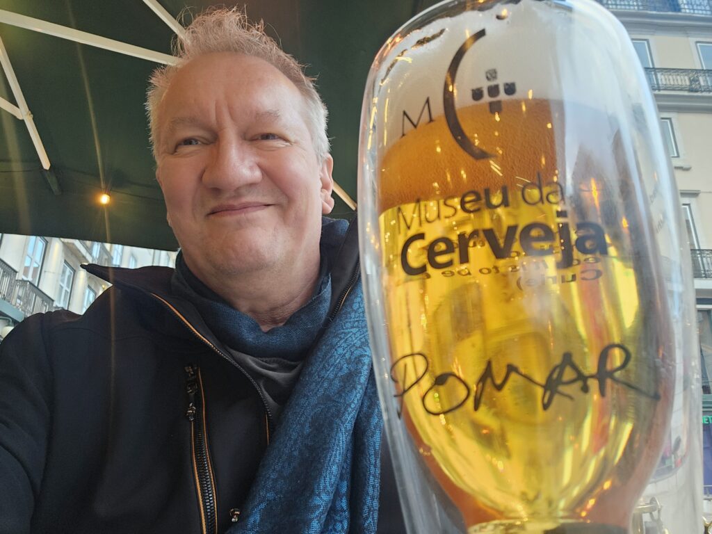 Mir war nach einem Bier, meinen Plattfüßen nach Pause. So schlug ich mich noch in das Bairro Alto durch, dem Ausgehviertel Lissabons. Tja, tagsüber ist da tote Hose. Kurz überlegte ich, mir einen Glühwein auf dem Weihnachtsmarkt am Miradouro de São Pedro de Alcântara zu gönnen, aber es wurde zusehends ungemütlicher und begann auch, zu nieseln. Ich latschte meerwärts, und als es stärker regnete, stand ich vor besagter Büste Pessoas am Café A Brasileira. Ich flüchtete zu einem beschirmten Sitzplatz und bestellte ein Bier und dann noch eins. Das schmeckte ganz hervorragend und wurde in einem ganz tollen Glas ausgeschenkt. Intermezzo: Portugal ist wirklich noch preiswert. Intermezzo Ende. Pointe: Die zwei Biere brachten mich um 20 Euro. Pointe Ende.