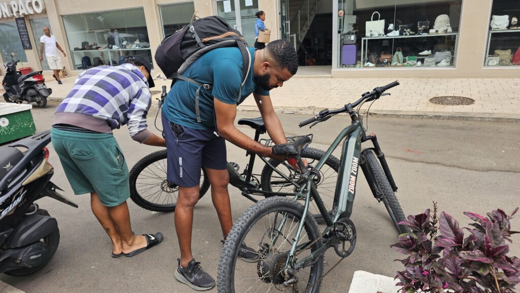 Ab Calhau geht es dann für etwa 15 Kilometer über Kopfsteinstraßen. Leute, mich hat es dermaßen durchgeschüttelt! Inzwischen taten mir auch Schulter und Nacken weh, ich bin die für mich unnatürliche Haltung auf dem Fahrrad nicht gewohnt. Und ich schwächelte. Ich hielt an und probierte, ob der E-Schub noch funktionierte. Er tat es nur sehr mau. Marcio tauschte das Rad mit mir, er sei ja trainierter. Und boooom, ging die Post ab, sein Antrieb war viel stärker als meiner. So stellten wir fest, dass auch mein Pedelec von Anfang an nicht ganz in Ordnung war.