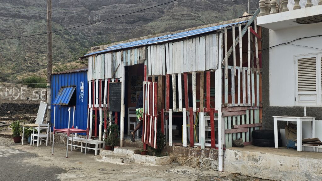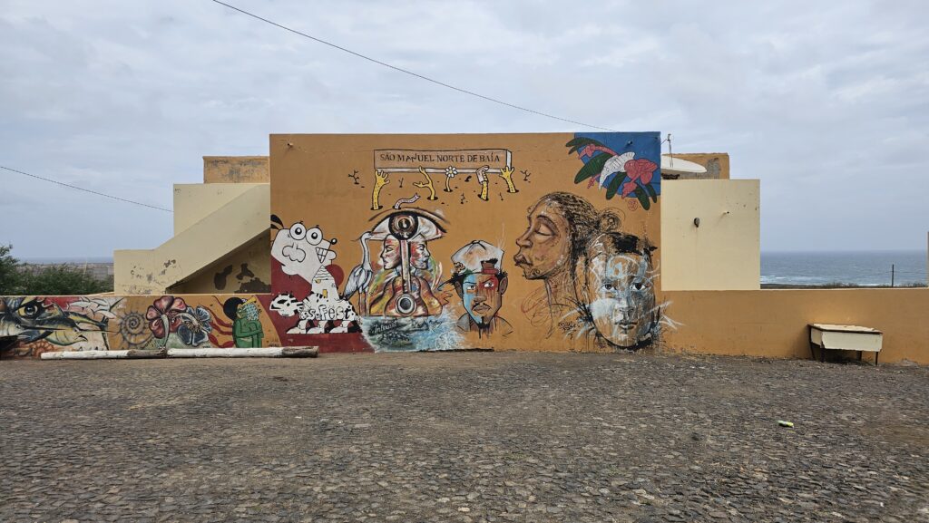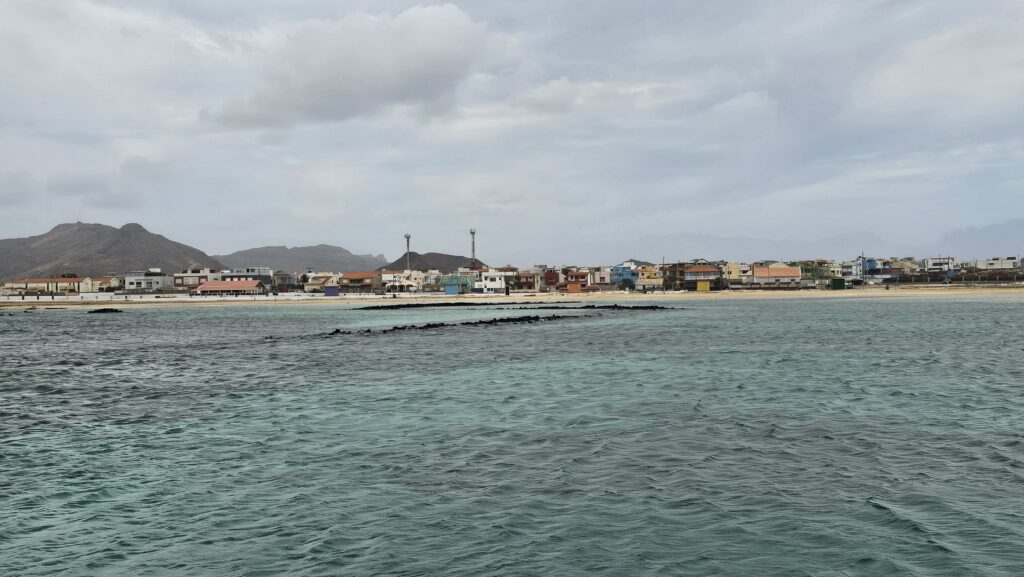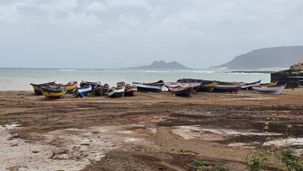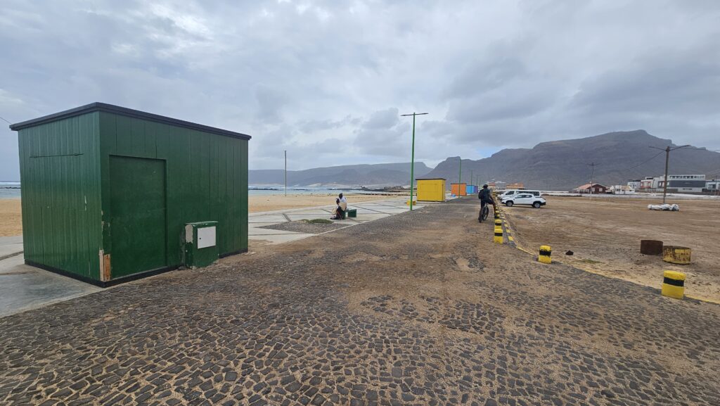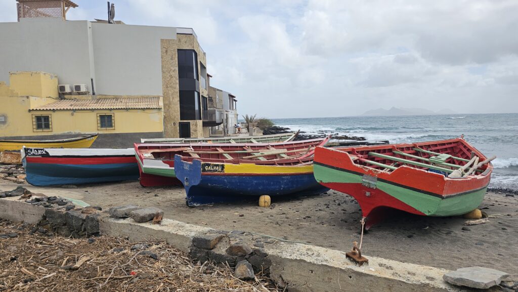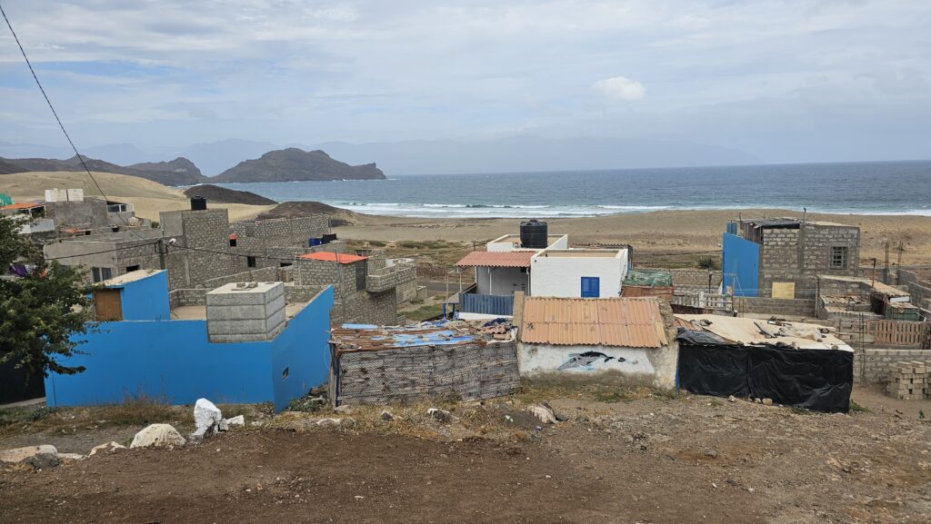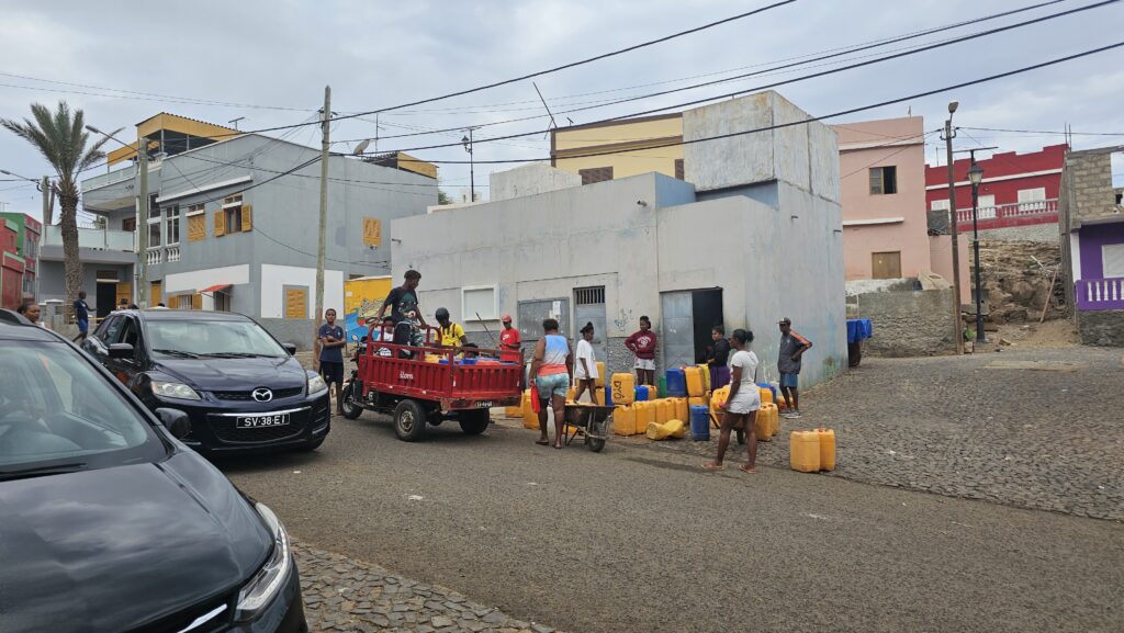 Man darf sich Fischerdörfer hier jetzt nicht so idyllisch wie auf griechischen Inseln vorstellen. Ein Mix aus bunten Häusern, Rohbauten, viel Gewusel, kein Tinnef. Die Fischer können hier nicht an der Küste Ihre Beute einholen, das Meer ist mit Plastik verseucht. Sie fahren für mehrere Tage weiter hinaus, Richtung der unbewohnten Insel Sta. Lucia, um dann hoffentlich mit reichem Fang zurückzukehren. Damit dieser nicht vergammelt, brauchen sie Tonnen von Eis, das im Ort in Kooperation mit einer japanischen Firma produziert wird. São Vicente hat kaum eigenes Wasser, daher gibt es auch nur wenig Landwirtschaft. Meerwasserentsalzungsanlagen und ein bisschen Grundwasser stellen die Versorgung sicher. Als wir ankamen, war gerade Wasserverteilungsorgie, das halbe Dorf füllte Kanister mit Trinkwasser aus dem einen Reservoir und Brauchwasser aus dem anderen.