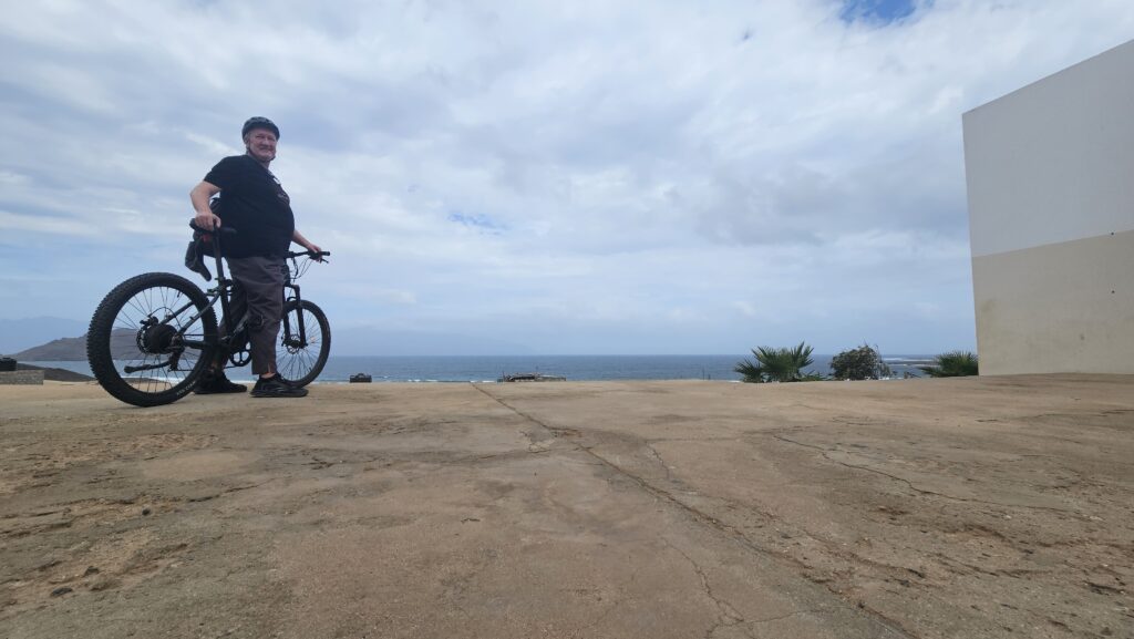 Die Fahrräder waren jetzt nicht gerade letzter Stand von Wissenschaft und Technik, bei Marcio fiel nach einem Meter die Kette ab (das sollte noch öfter passieren) und auch die Elektrik hakelte. Bei meinem Rad schien soweit erst einmal alles okay. Los ging’s. Wir fuhren durch die Innenstadt Richtung Nordosten, unser erstes Ziel sollte das Fischerdorf Salamansa sein. Es wehte ein ausgewachsener Sturm, und das in unser Gesicht. Aber kein Problem, wir hatten ja E-Bikes. Übrigens, eine Premiere für mich, bin ich noch nie mit gefahren. Dann kam eine nicht enden wollende 10%-ige Steigung zum Sturm dazu, da half dann auch die Tritt-Unterstützung, oder wie auch immer das heißt, nicht mehr. Ich fiel deutlich zurück, hatte erste Nahtoderfahrungen, denn die Pumpe drohte zu platzen. Und das nach etwa 2 von 7246 Kilometern. Marcio kehrte um und brachte mir bei, dass es da noch einen Speed-Gashebel gibt. Achso, aha. Mit dem war es zwar auch kein Zuckerschlecken, aber ich konnte mich dann wenigstens im Schneckentempo unter viel Gestöhne fortbewegen. Wie die Band Blood, Sweat and Tears aber schon 1968 wusste: „What goes up, must come down“ und heia! rasten wir bergab. Das sollte auch der schlimmste Part der Strecke gewesen sein.