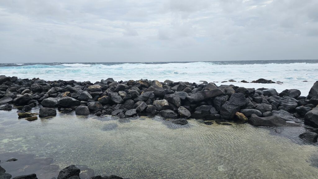 Wir fuhren weiter nach Baia das Gatas, Zentrum der Welsfischerei, auf portugiesisch „peixe-gatas“, catfish. Hier gibt es überdurchschnittlich warme, natürliche Schwimmbecken, daher ist der Ort auch als Badeparadies bekannt. Ein langer Steg führt ins Meer hinaus, den fuhren wir bis zum Ende, wo wir einen jungen Schweizer trafen, der auch eine geführte Inselrundfahrt, aber mit einem Auto gebucht hatte. Gott, war ich neidisch! Wir begegneten ihm dann noch ein paar Mal wieder, da sturzbachartige Regenfälle im Sommer des Jahres viel Zerstörung angerichtet hatten, unter anderem wurden Teile der Straßen weggeschwemmt. Daher kamen wir mit den Rädern fast genau so schnell voran.