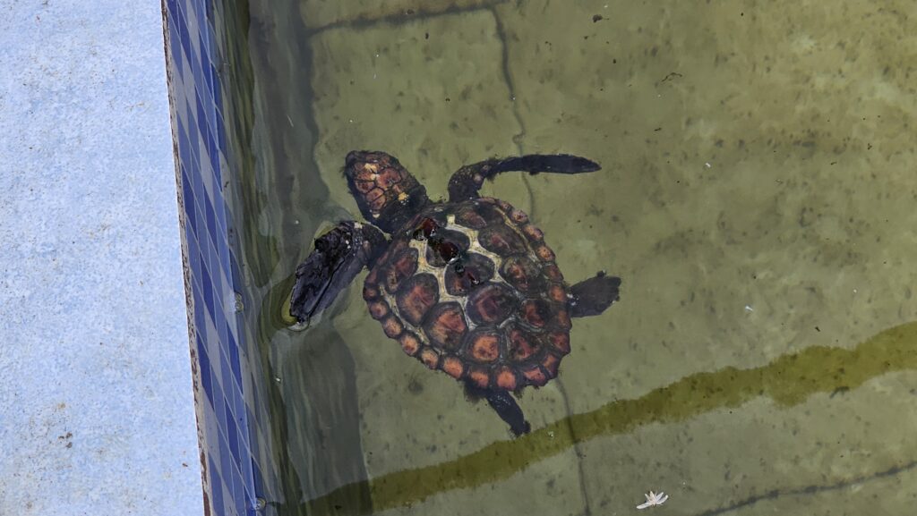 Die sich anschließende Strecke nach Calhau ist ein Traum! Auf und ab, in leichten Kurven immer am Meer entlang. Wilde und unberührte Natur. Einen Zwischenstopp mchten wir in Norte 1, wo ein Künstlerkollektiv aus mehreren Ländern einige der Häuser bemalt hat. Marcio engagiert sich hier in einem Hilfsprojekt, da der Ort durch das Unwetter abgeschnitten war und einige Bewohner vieles, wenn nicht sogar alles verloren hatten. Es gibt immer noch Vermisste. In Calhau besuchten wir die Außenanlage der Schildkrötenrettungsstation. Es gab zwei sehr große Stammgäste, die zum Wiederauswildern zu verletzt waren. Daneben ein kleineres Becken mit zwei Babyschildkröten, die dort abgeliefert wurden. Die beiden großen Tartarugas lagen ganz unten im Becken, aber als ich eine Spende in den bereitgestellten Kasten warf, tauchte die armlose auf und nickte mir zu. Ich schwöre! Selbst Marcio war ganz perplex: „She seems to say Thank you!“. Schildkrötenweibchen legen zwischen 80 ud 120 Eier. Vom Nachwuchs überlebt durchschnittlich wohl nur ein Prozent, es gibt zu viele Fressfeinde. Und natürlich den Menschen.