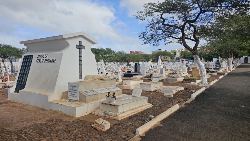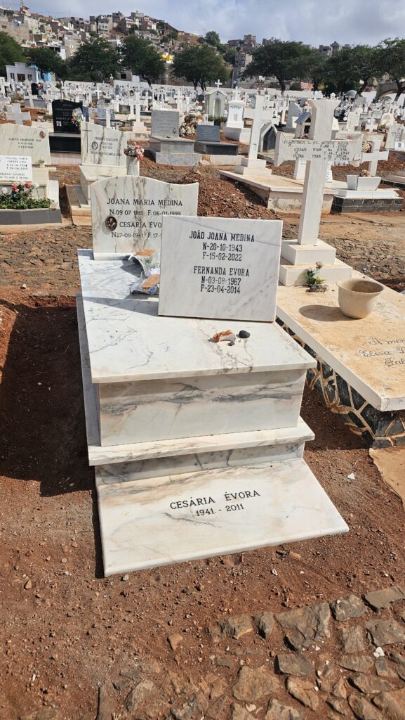 Nach einer ermüdenden Kopfsteinpflasterfahrt, auf der ich von Autos träumte, erreichten wir wieder die Außenbezirke Mindelos. Hier ist der riesengroße Friedhof der Stadt. Ich bat um einen Stopp, um das Grab Cesária Évoras zu besuchen. Marcio hatte etwas Probleme, es zu finden, aber ein Passant zeigte es uns dann, sie wurde wohl zwischenzeitlich umgebettet. Für eine so berühmte Künstlerin ist es ein sehr schlichtes, bescheidenes Grab. Ihre Mutter und ihre Tochter sind dort ebenfalls bestattet.