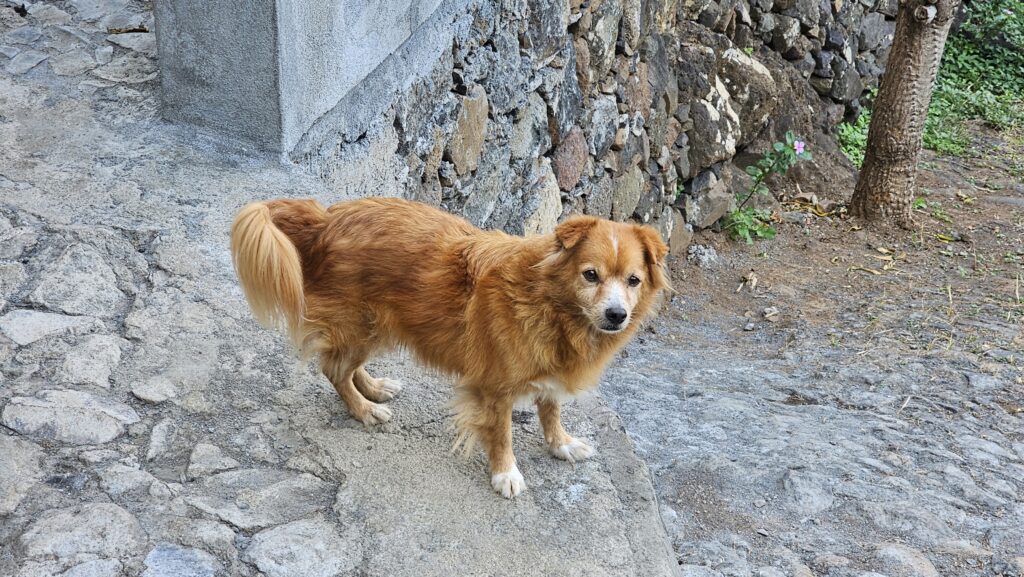 Nun, ich könnte jetzt hier drei Tage angepisst rumgreinen, aber ich beschloss, noch weiter in die Berge vorzudringen. Begleitet von dem sehr zutraulichen Fernando (der blonde Hund). Ich sach mal so. Wenn für morgen 5 Stunden für die Wanderung veranschlagt sind, kommen wir 500 Meter weit. Aber es ist schon paradiesisch hier. Mangobäume, Kokospalmen, Zuckerrohr, Bananenstauden ohne Ende. Santo Antão verfügt über Quellen und – wie Madeira – über ein Levadasystem zur Wasserverteilung. Ich versuche mal, mich anzufreunden…