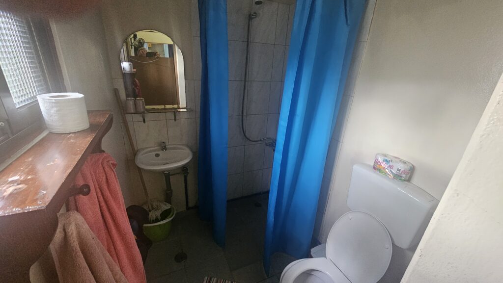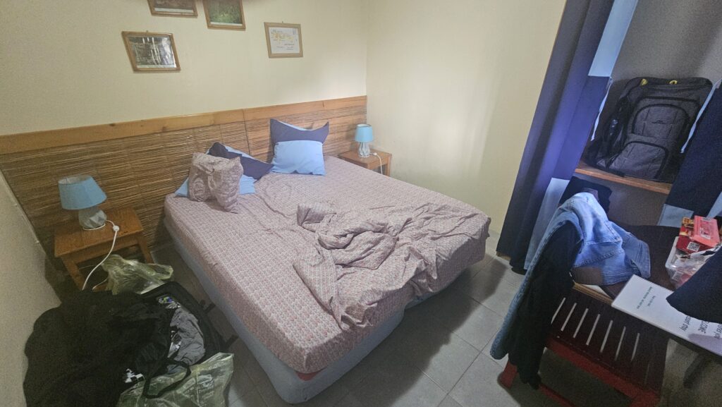 Ich legte mich erst einmal wieder hin. Hinlegen ist immer ein guter Plan. Nach einem kurzen Nickerchen fiel mir mein Frühstücksbeutel wieder ein. Noch nie war ein durchgeweichtes Käsesandwich sooo willkommen! Der Joghurt war zwar Kokos-Geschmack, aber erstaunlich lecker. Ich schaute mich anschließend auf dem Areal um. Das Hotel ist eines der Sorte, das man in den Alpen verklagen würde, hier aber urig findet. Ein deutliches Downgrade zu Mindelo. Aber ich habe es noch gut getroffen, es gibt Zimmer, da muss man über den Hof in sein Bad oder aufs Klo. Immerhin hat es einen „Pool“. Gut, bringt mich persönlich auch nicht weiter.