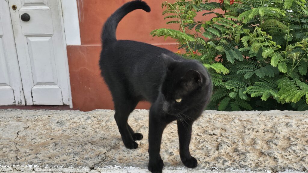 Ich überlegte ein bisschen hin und her, ob ich mir für abends einen Tisch sichern sollte; aber irgendwie ist es die letzten Jahre ja auch ein bisschen eingerissen, dass ich mir in der Unterkunft Schnittchen mache. An solchen Feiertagen alleine auswärts zu essen, lässt einen doch immer sehr wunderlich erscheinen. Sicherheitshalber schaute ich noch beim deutschen Honorarkonsul nach, ob der vielleicht einen Empfang für alle Deutschen auf der Insel gibt, aber ich fand keine Hinweise. Also, ab in den Supermarkt. Und schon sind wir wieder bei der No-Stress-Thematik. Denn auch der Kapverdianer neigt dazu, Weihnachten alles auf den letzten Drücker zu erledigen. Vor den Geldautomaten standen meterlange Schlangen. Die Stadt war rappelsvoll, jeder Pröddelladen war rappelsvoll, die Supermärkte waren rappelsvoll. Dafür aber dann auch geplündert wie nix. Ich fand ein Netz Käsebällchen, einen kleinen Orangenkuchen und eine Tüte Mandelkrokant. Die Schokolade für 7 Euro die Tafel ließ ich liegen. In der Zentralbäckerei erhaschte ich eins der letzten Brötchen. Und so habe ich jetzt gerade ein äußerst bescheidenes Heiligabendessen. Aber das war, wie ja bei vielen Familien, bei uns nie besonders ausgefallen, sondern immer sehr schlicht.