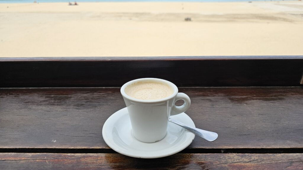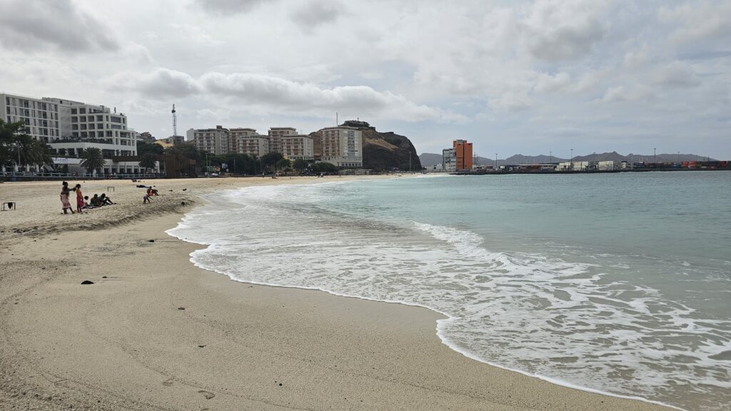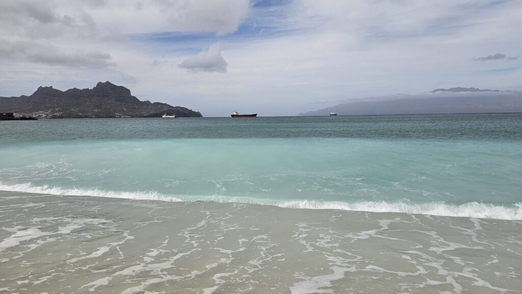 Dann hockte ich mich ins Strandcafé, bekam endlich mal wieder einen heißen und starken Kaffee (hier ist leider oft lauwarme Thermoskannenbrühe angesagt) und glotzte aufs Meer und Santo Antão. Der Strand ist klein, aber nett, das Wasser sieht sauber aus und es ist nicht überlaufen.