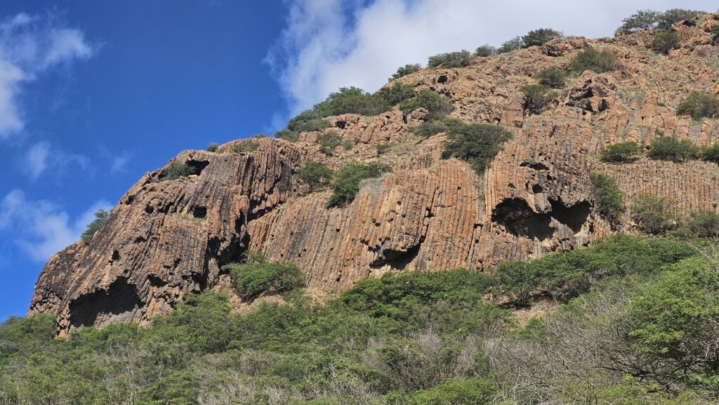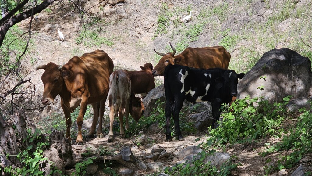 Ich kraxelte die Hügel hoch und war nach kurzer Zeit ziemlich hinüber. Auf Antão hatten wir 23 Grad, hier sind es gefühlte 30. Schlimmer aber war, dass über dem Weg plötzlich eine milchflaschendeckelgroße Spinne hing. Ob die sich wohl auf Wanderer stürzte? Augen zu und durch. Es wurde immer steiler. Aber ich hatte einen schönen Ausblick auf die Bucht und Tarrafal. Auf einmal lag ein halbes Dutzend Kühe auf dem Weg, inklusive zweier Kälber. Nicht neben dem Weg, sondern mitten drauf. Links eine Schlucht, rechts eine Felshalde. Wir starrten uns eine Weile schweigend an. Die Kühe und ich. „Könntet Ihr vielleicht irgendwie…?“. Die Herde starrte. Ich kniff und zog mich zurück. Reisen kann so einfach sein, wenn man ein paar Grundregeln beachtet. Don’t mess with cows, when you’re a coward.