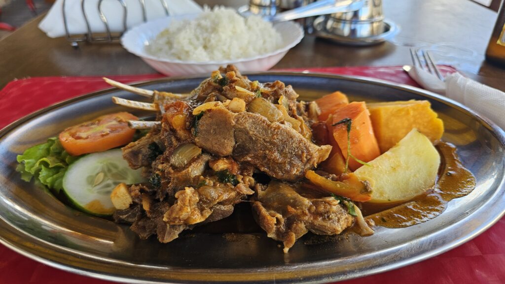 Inzwischen war es schon wieder weit nach 15 Uhr und ich hatte Hunger wie nix. Ich lief an drei Restaurants mit Kegelschnecken vorbei, die keine Kegelschnecken hatten, als der dritte fragte, ob ich Ziege möge? Also aß ich eine Art Ziegeneintopf mit Gemüse und dem allgegenwärtigen Reis. War sehr lecker, wenn auch, wie die Muräne, mit vielen „Gräten“.