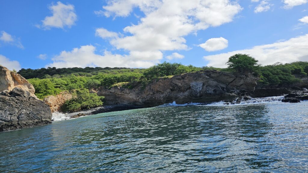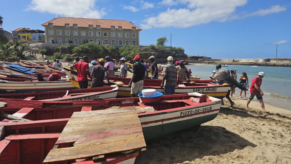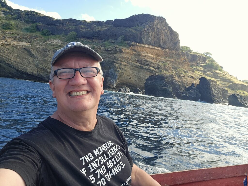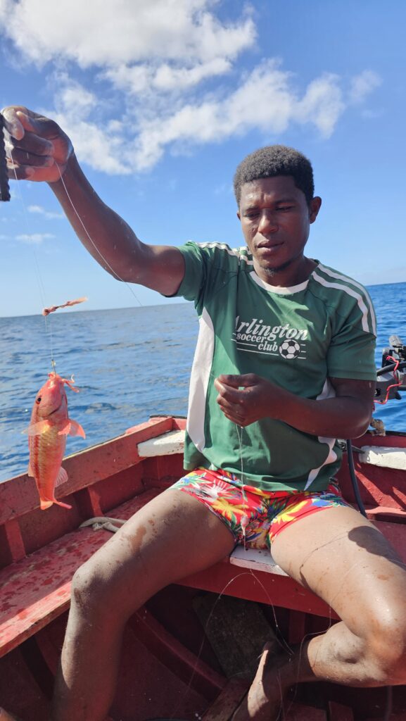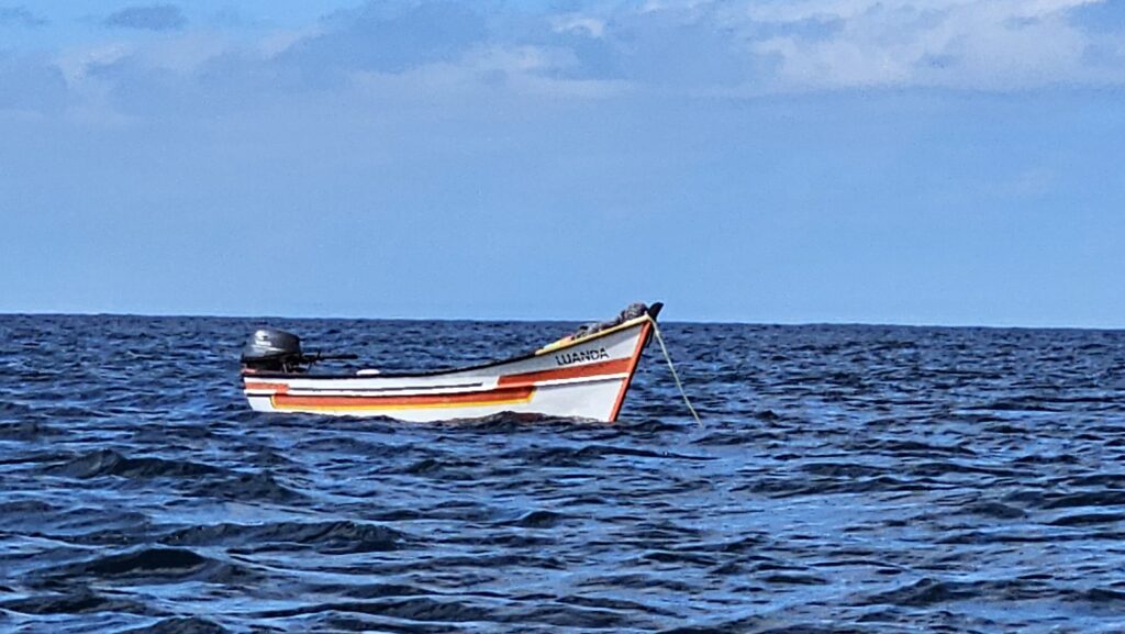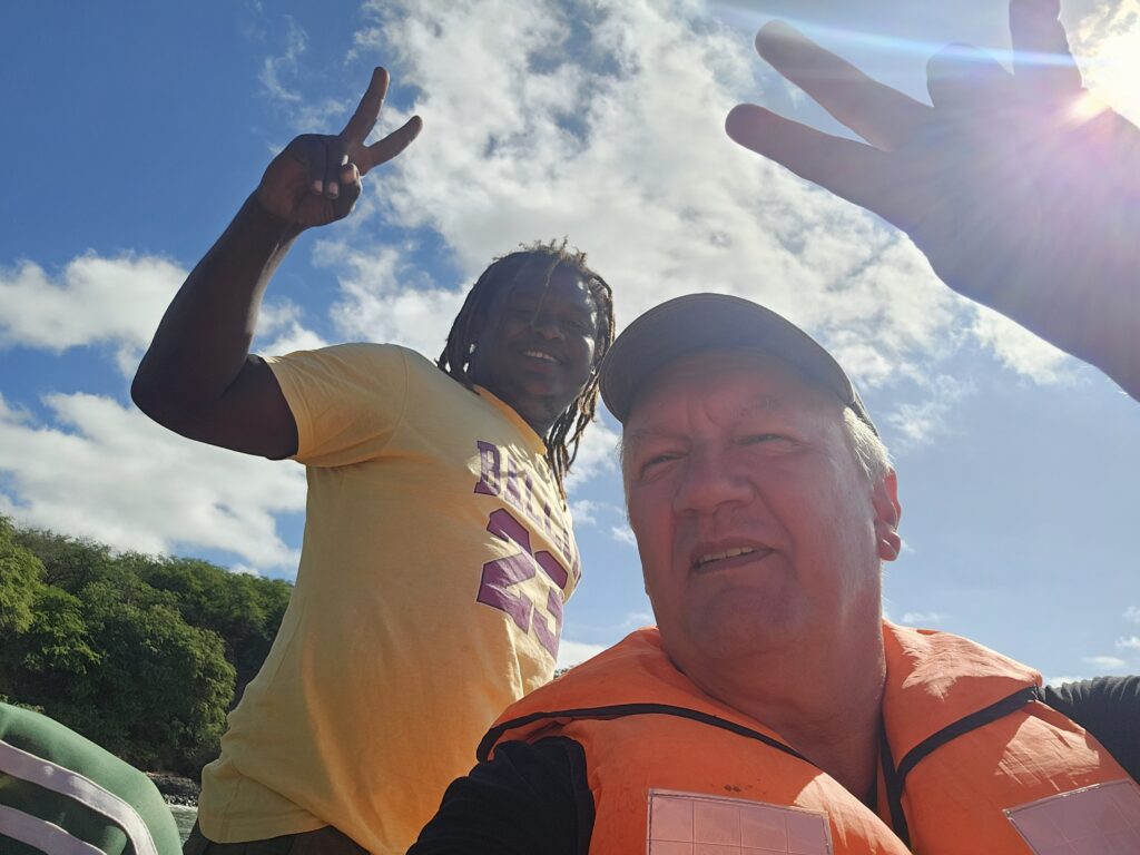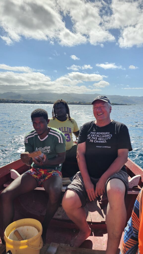 Ich bin froh, dass ich meinen Lebensunterhalt nicht mit Fischen bestreiten muss. Ich bin der wohl untalentierteste Fischer der Welt. JPs Begleiter holte einen Fisch nach dem anderen aus dem Wasser, JP zwar nur einen, dafür aber einen ziemlichen Brummer, die Familie zwei kleine Fische, die wieder in die Freiheit entlassen wurden. Mit einem Loch im Maul halt. Bei mir wurde immer der Köder abgeknabbert, ohne, dass einer zubiss. Die Ehefrau sah einen Manta, ich einen riesigen Schwarm tieffliegender Fische. Die Tochter (vielleicht 5 oder 6 Jahre) durfte für die Fahrt auf die andere Buchtseite das Boot steuern, Papa dann von dort aus wieder zum Hafen. Er schien wieder besserer Laune. Am „Hafen“, der ja nur ein Strand ist, angekommen, war es wegen des Wellengangs schwer, anzulanden. Man wartete auf die richtige Welle, um möglichst weit reingetragen zu werden, um dann eilends aus dem Boot zu springen, um es an Land zu ziehen. Der Onkel Gerry hat dann die richtige Welle abbekommen. Ich war pladdernass! Yeah. Mithilfe anderer Fischer zogen wir den Kutter den Strand hoch. Jetzt sollten die gefangenen Fische noch gemeinsam gegrillt und verzehrt werden. Aber mir war eher nach einer Limette und ich empfahl mich. Das war ein netter Ausflug. Und ich kann jetzt voller Stolz behaupten, ich sei fischen gewesen. Dass das erfolglos war, kann ja unter uns bleiben.