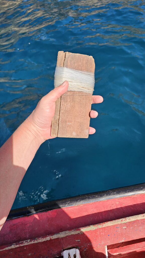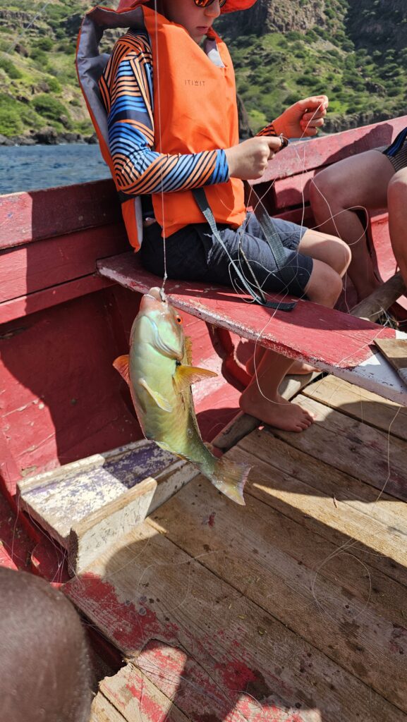JP holte mich pünktlich zur Bootstour am Hotel ab. Ob es mir etwas ausmachte, wenn auch noch eine Schweizer Familie mitführe? Es habe da gestern ein Missverständnis gegeben. „I guess I know these people“, sagte ich und war natürlich einverstanden. Ich nehme mal vorweg, dass das die Tour auch verbessert hat, denn so war die Unterhaltung etwas diverser. Aber als wir am Strand ankamen standen da nur Mutter und die beiden Nachwuchsfischer. Vom Daddy fehlte jede Spur. Er sei sauer auf die Veranstalter, erfuhr ich von der Gattin. Nach 20 Minuten Warterei lief ich mit dem Sohnemann zum Hotel und trug meinen Unmut vor, es sei mein Ausflug und meine Zeit und ich hätte keinen Bock auf Rumzickerei. Er murmelte etwas von, sie machten das ja nur, damit sie Geld sparten, ich motzte, dass sei gerade egal, dann kam er auch endlich mit. Am Boot flüsterte ich noch allen zu, dass wir jetzt eine Menge positive Vibes bräuchten. Und dann war es auch sehr nett. Die beiden Kinder sind total nett, auch wenn sie manchmal vergaßen, dass ich kein Schwytzerdütsch (oder wie auch immer das geschrieben wird) verstehe. Wir tuckerten ein wenig durch die Bucht, am „schlafenden Elefanten“ vorbei zum Leuchtturm und ankerten dann in einer ruhigeren Ecke, um zu fischen.