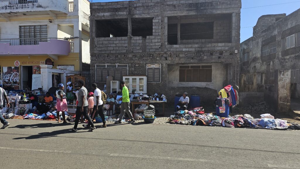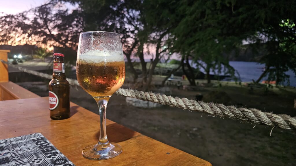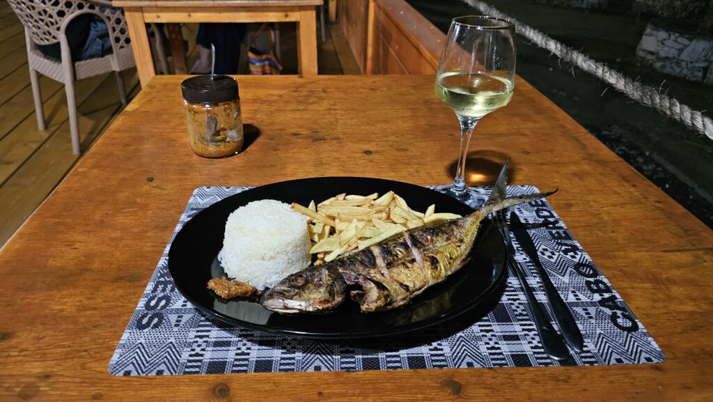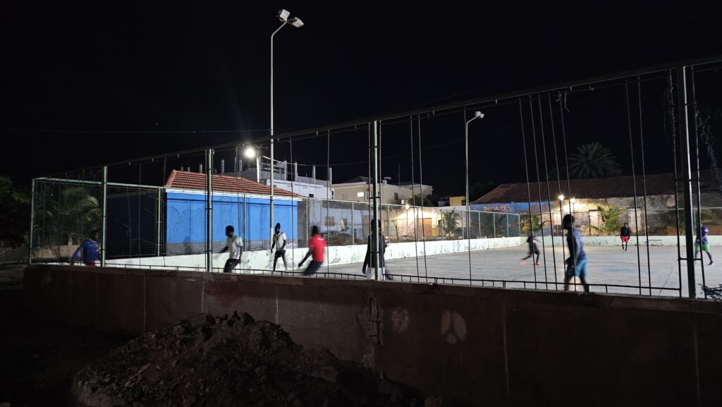 Auf dem Tisch der Feiergesellschaft stand übrigens nicht ein Glas Alkohol. Das wäre bei uns ja unvorstellbar. Links neben dem Restaurant ein Bolzplatz, wo mit viel Enthusiasmus ein Spiel ausgetragen wurde. Rechts die Meeresbrandung. Vorne der Sonnenuntergang. Mein Fisch dauerte ewig, aber ich hatte tatsächlich no stress damit. Und statt des Gemüses gab es Fritten. No Stress. Egal. Aber: Fritten kann man hier einfach nicht. Die sind immer so lätschig, als wären sie von Belgien hierhergeschwommen. Naja, dafür halt keine Acrylamide.