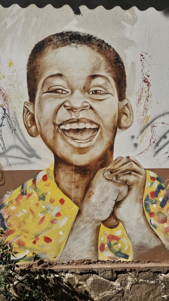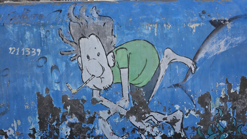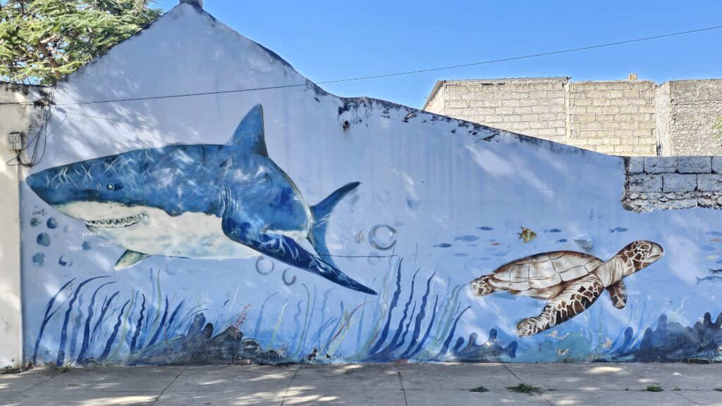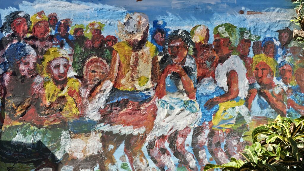 Wer auch hier lebt, sind große, dicke Wespen (?), die sich durch winzige Löcher in Palmenstämme zwängen, das ist schon faszinierend! Ihr seht, ich verzweifelte fast vor Langeweile. Ich lief durch den Ort und knipste Wandmalereien. Herrjeh. Aber: Wenn Horst Tappert das noch hätte erleben dürfen!