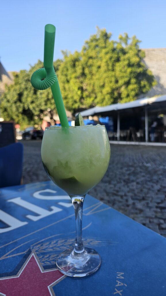 Es war Zeit für den Caipirinha am Strand. Inzwischen ist aber feiertagsbedingt das Touristenaufkommen – auch das inländische – dermaßen hoch, dass an der Kasse 30 Menschen anstanden, an der Ausgabe noch einmal so viele. Ich sagte dem Strand Adieu und nahm einen Cocktail im „Storchen“, wo ich meine Vermieterin mit ihrem Mann José traf. Klingt jetzt sehr nach deutscher Provinz, gelle? War beabsichtigt. Der Storch heißt natürlich „A Cegonha“ und hat keine Geweihe an der Wand.