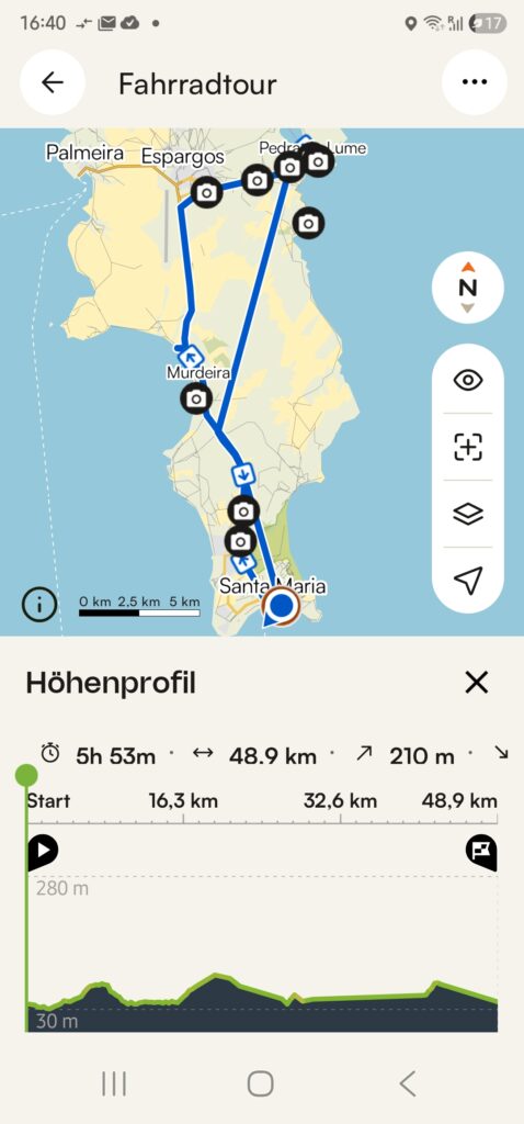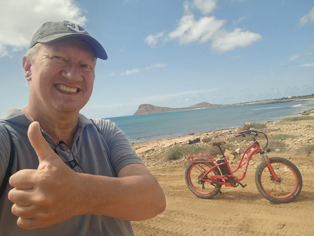 Also, was auch immer das gestern war, es ist halbwegs überstanden. Das Frühstück habe ich auf ein Spiegelei und eine Tasse Kaffee beschränkt, danach ging es ab zum Fahrradverleih. Da boxte der Papst im Kettenhemd! Ich bekam das letzte verfügbare E-Rad. Ein Trumm sondergleichen. Aber mit Akku bis zum Schluss und einer enormen Antriebsleistung (schon auf kleiner Stufe). 25 Euro kostet das für einen Tag. Man bekommt eine lächerlich unnütze Inselkarte, auf der aber immerhin die Nummer für Notfälle steht.