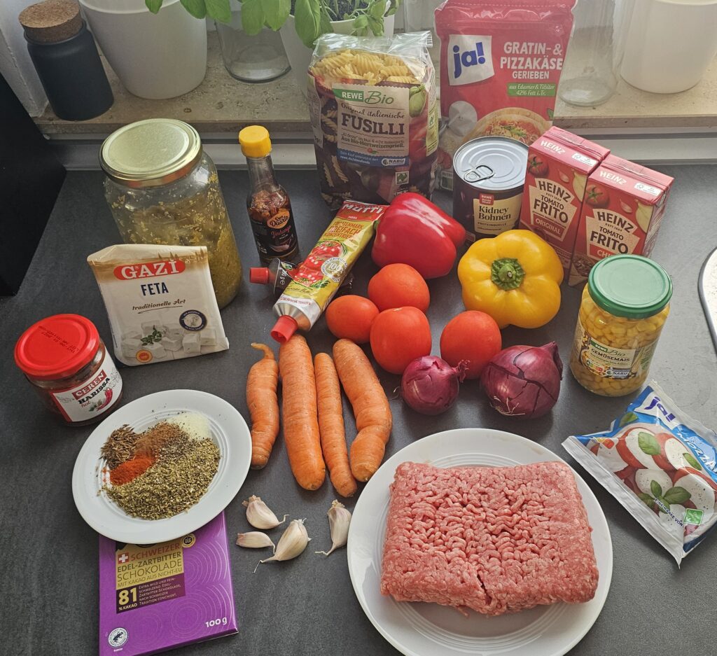 Statt der roten Chili habe ich das Chili-Öl von den Kapverden und Harissa aus dem Glas genommen. Weitere Scharfmacher sind Rosenpaprika und Chiliflocken. Außerdem an Gewürzen: Zimt, Kreuzkümmel, Salz, Pfeffer, Oregano. Im großen Glas meine Gemüsebrüh-Paste. Nudeln habe ich noch ein halbes Paket mehr genommen.