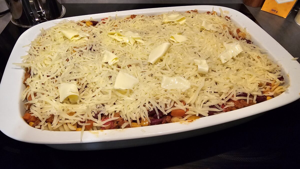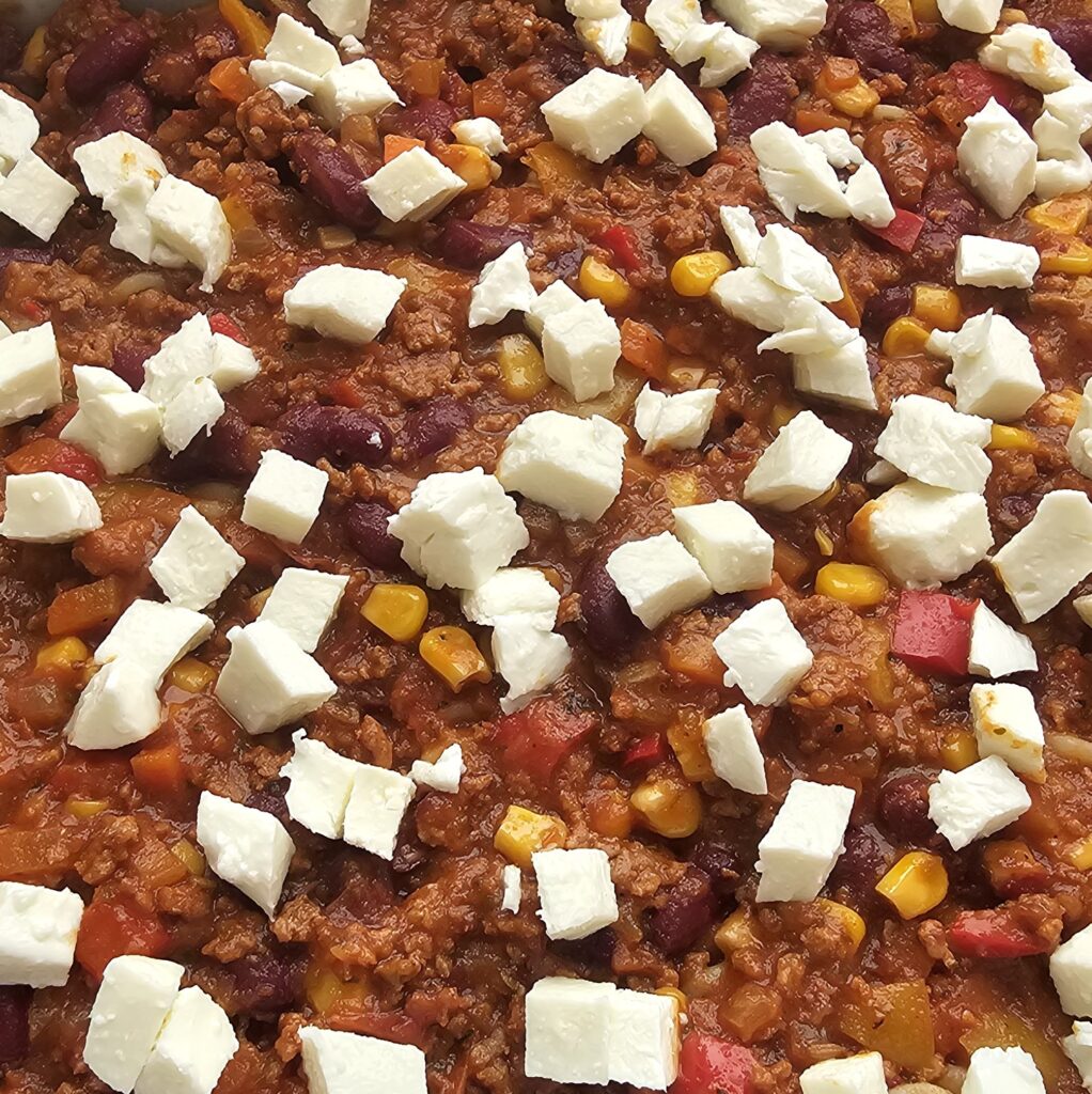 der Rezeptname klingt zwar, als ob es für eine sofortige Gefäßverstopfung geeignet wäre, aber wahrscheinlich ist das sogar zutreffend. Die Basissauce für diesen Auflauf ist mein Chili con Carne, wobei ich diesmal noch Paprikawürfel hineingegeben habe, sowie frische Tomaten.