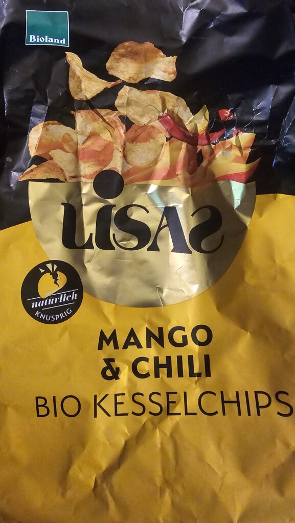 Mango&Chili-Kesselchips der Fa. LISAS, die im Allgäu ihre Wirk- und Werkstätten hat. Im Gegensatz zu den zuletzt bewerteten Chips sind diese Weltklasse!
