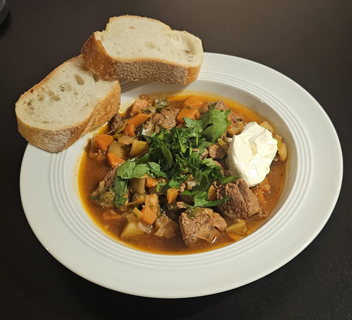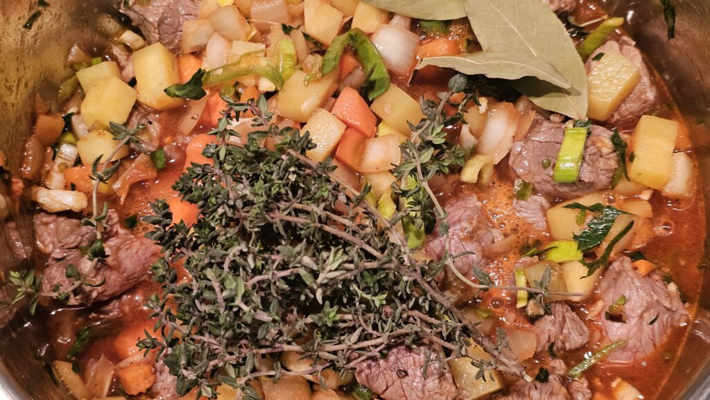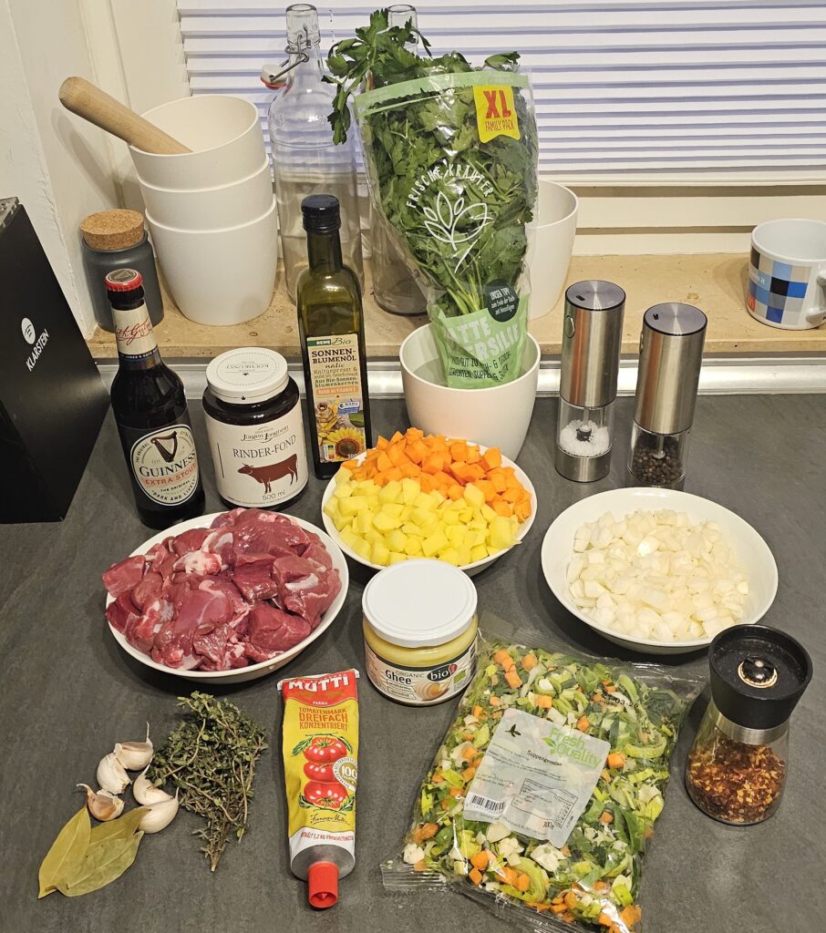 In heißem Butterschmalz (alternativ hoch erhitzbares Öl) brate ich 1 kg Lammgulasch scharf an, ich habe es nicht so mit Hammel. Das Fleisch nehme ich dann heraus und stelle es im Ofen warm. Dann gebe ich etwas Sonnenblumenöl in den Topf und brate darin unter Zugabe von zwei gehäuften Esslöffeln Tomatenmark drei kleingeschnittene Zwiebeln, etwas gehackten Knoblauch, eine große Packung Suppengrün (siehe Foto) und eine Handvoll gewürfelter Karotten sowie zwei Handvoll gewürfelter Kartoffeln an. Dann gebe ich das Fleisch wieder dazu und lösche alles mit einem Glas Rinderfond und einer kleinen Flasche Guinness ab, salze und pfeffere das ganze, gebe ein paar Chiliflocken (ersatzweise Cayennepfeffer) dazu, versenke zwei Lorbeerblätter und ein paar Zweige Thymian und schmore das Ganze etwa eine Stunde lang im Schnellkochtopf; im klassischen Topf oder Bräter dauert es dann eher zweieinhalb Stunden. Thymian und Lorbeer rausfischen, abschmecken, ggf. mit etwas Mehlbutter binden (ich mag es lieber flüssig), viel gerupfte Petersilie drauf und ab auf den Tisch. Baguette und der Klacks Crème fraîche sind jetzt auch nicht typisch irisch, aber wir sind ja in Europa 🙂
