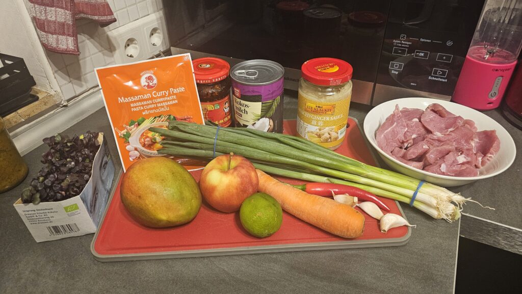 eigentlich ist das hier vorgestellte Rezept gar kein Massaman-Curry. Erstens, weil Kaeng-Masaman (so der thailändische Name) übersetzt Muslim-Suppe bedeutet und ich Schwein verwendet habe (was man aber durch Huhn, Rind oder Tofu ersetzen kann) und ich zweitens auch sonst bei den Zutaten ein bisschen gepfudelt habe. Was es aber dann zum Massaman-Curry macht, ist die Massaman-Paste, die ich verwendet habe: