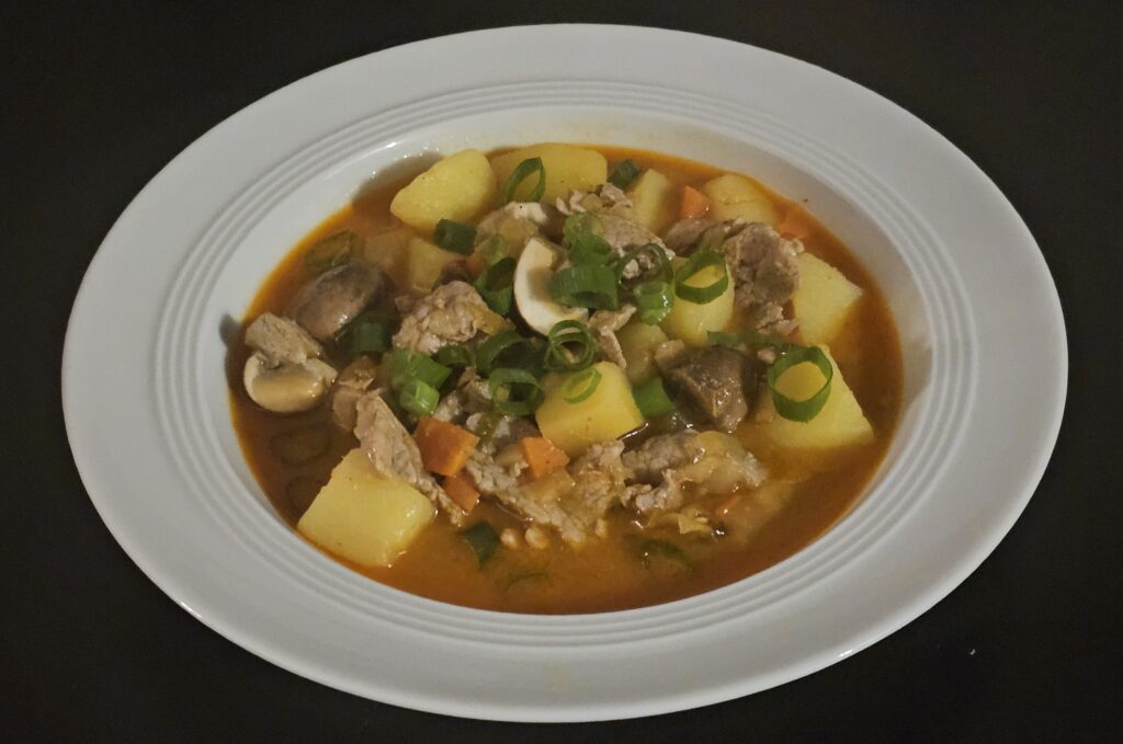 Am nächsten Tag hatte ich noch gut was übrig, da habe ich dann statt Reis als Beilage gekochte Kartoffelwürfel im Curry aufgewärmt und auch noch ein paar Champignons hinein gegeben. Sehr lecker!
